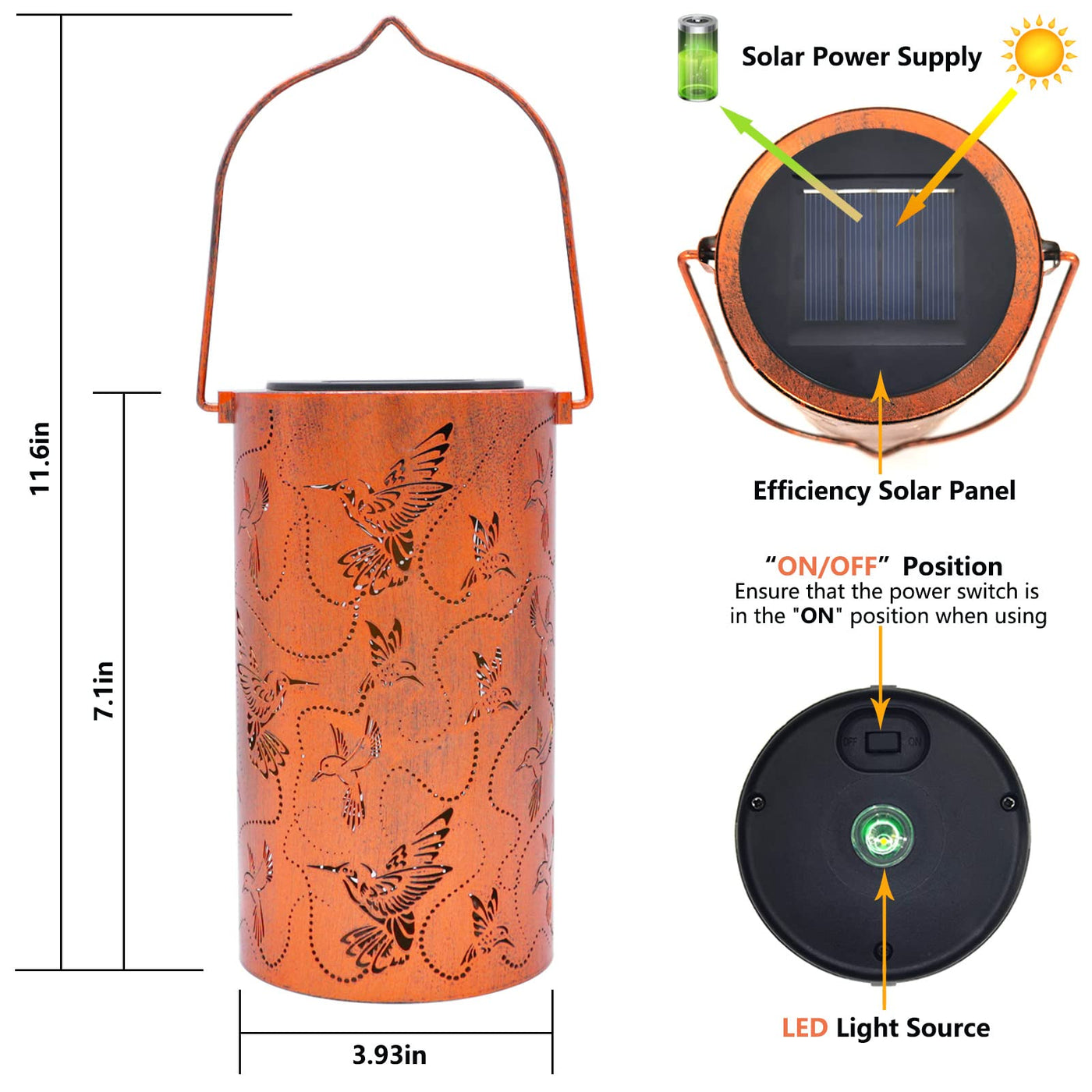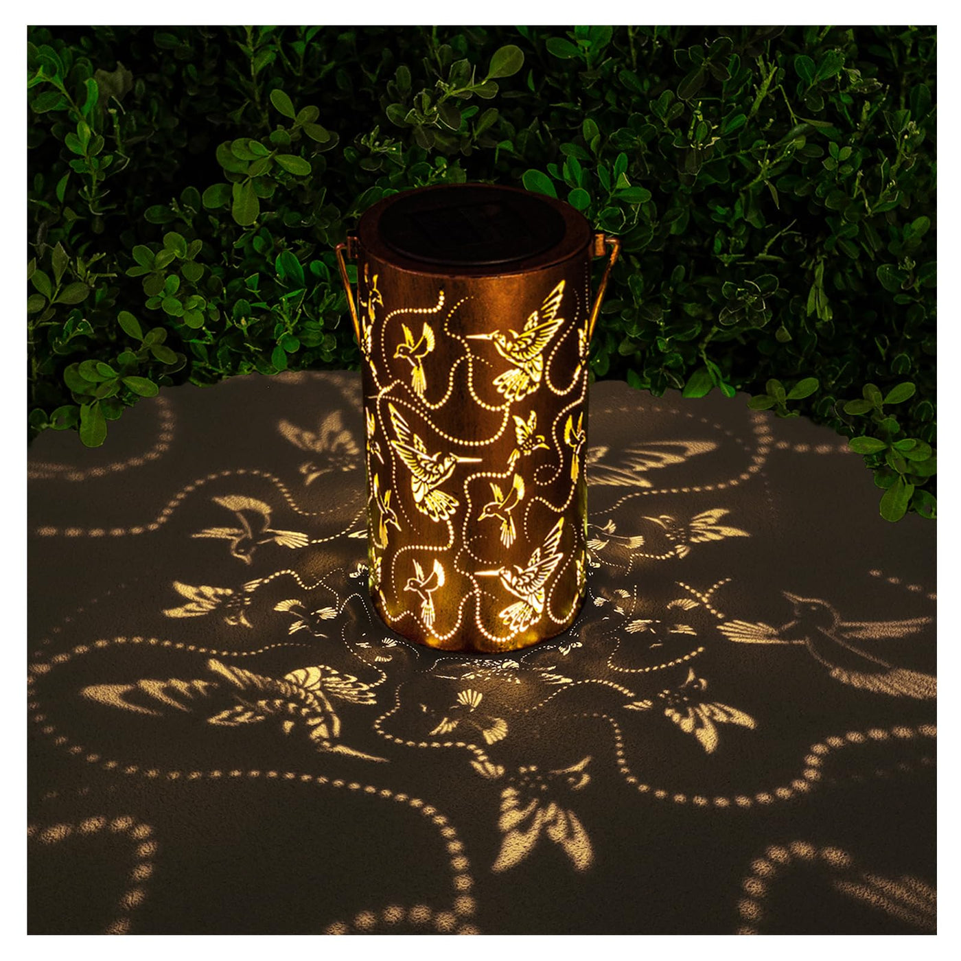 Q: What is the design of the solar lantern like?A: The solar lantern features a graceful decorative design with a retro appearance, gold copper color, and hollow out metal veneer, showcasing beautiful hummingbird patterns.