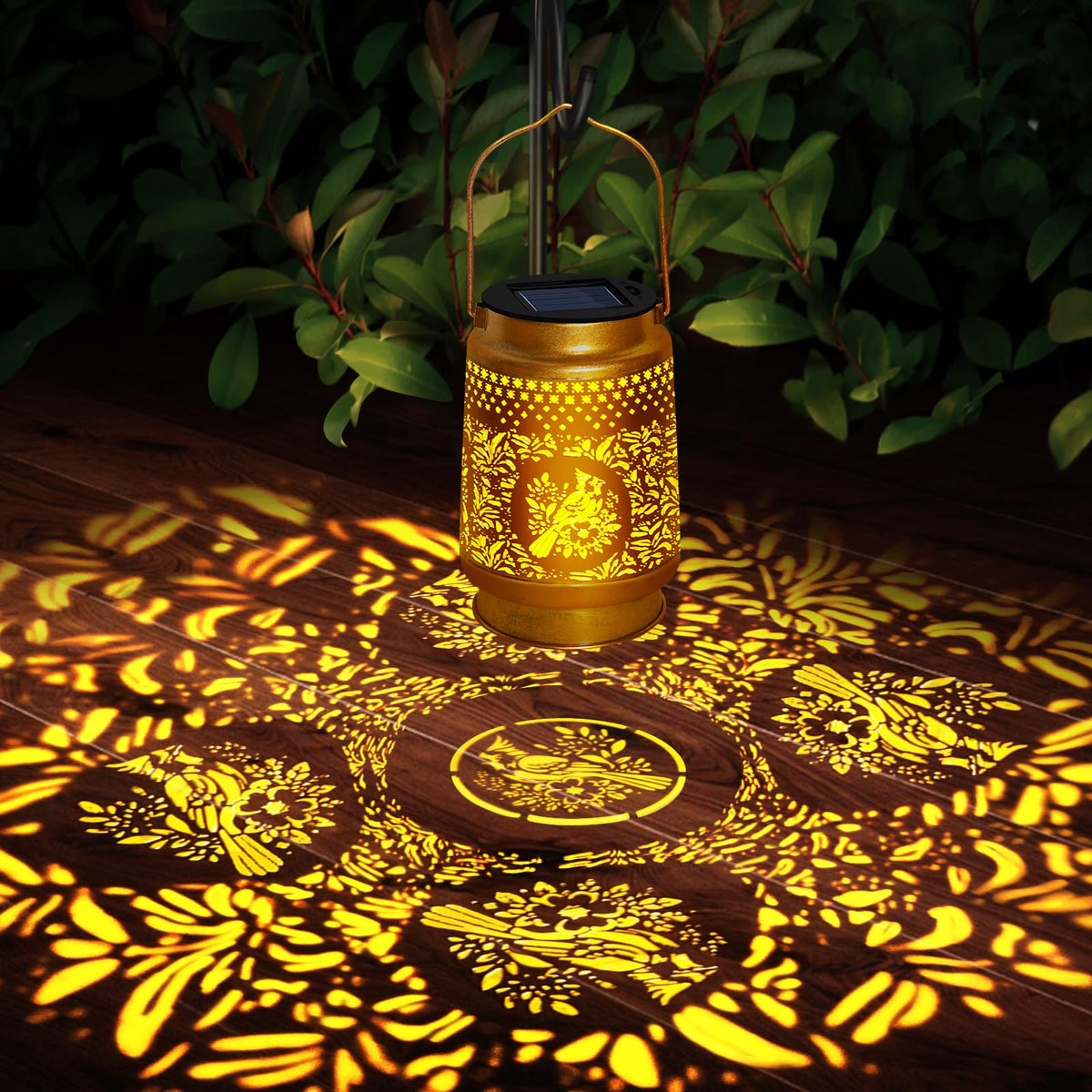 Q: What design features make the Cardinal Solar Lantern unique?A: The lantern features an intricate hollow design that casts beautiful cardinal light patterns onto your space. Additionally, its vintage gold copper finish adds a timeless and charming touch to any garden or outdoor setting.