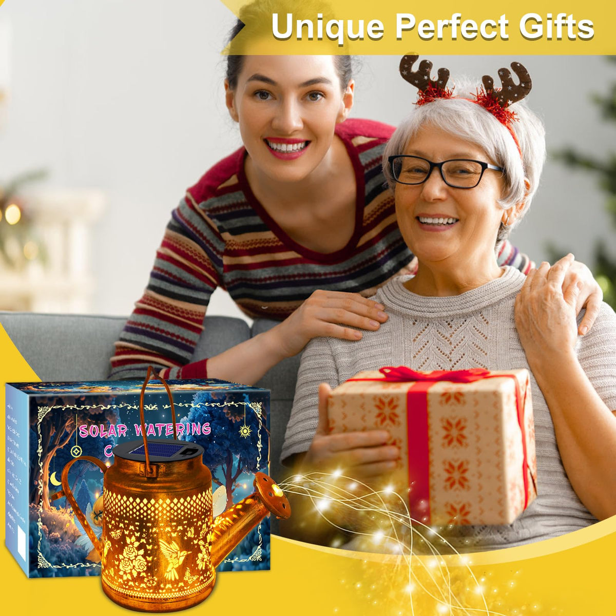 Q: What makes this solar lantern a great gift option?A: This solar watering can light features a unique handmade design with whimsical fairy and star motifs, making it a charming addition to any garden. Its enchanting ambiance and eco-friendly lighting solution make it an ideal gift for occasions like birthdays, Mother's Day, or holidays.