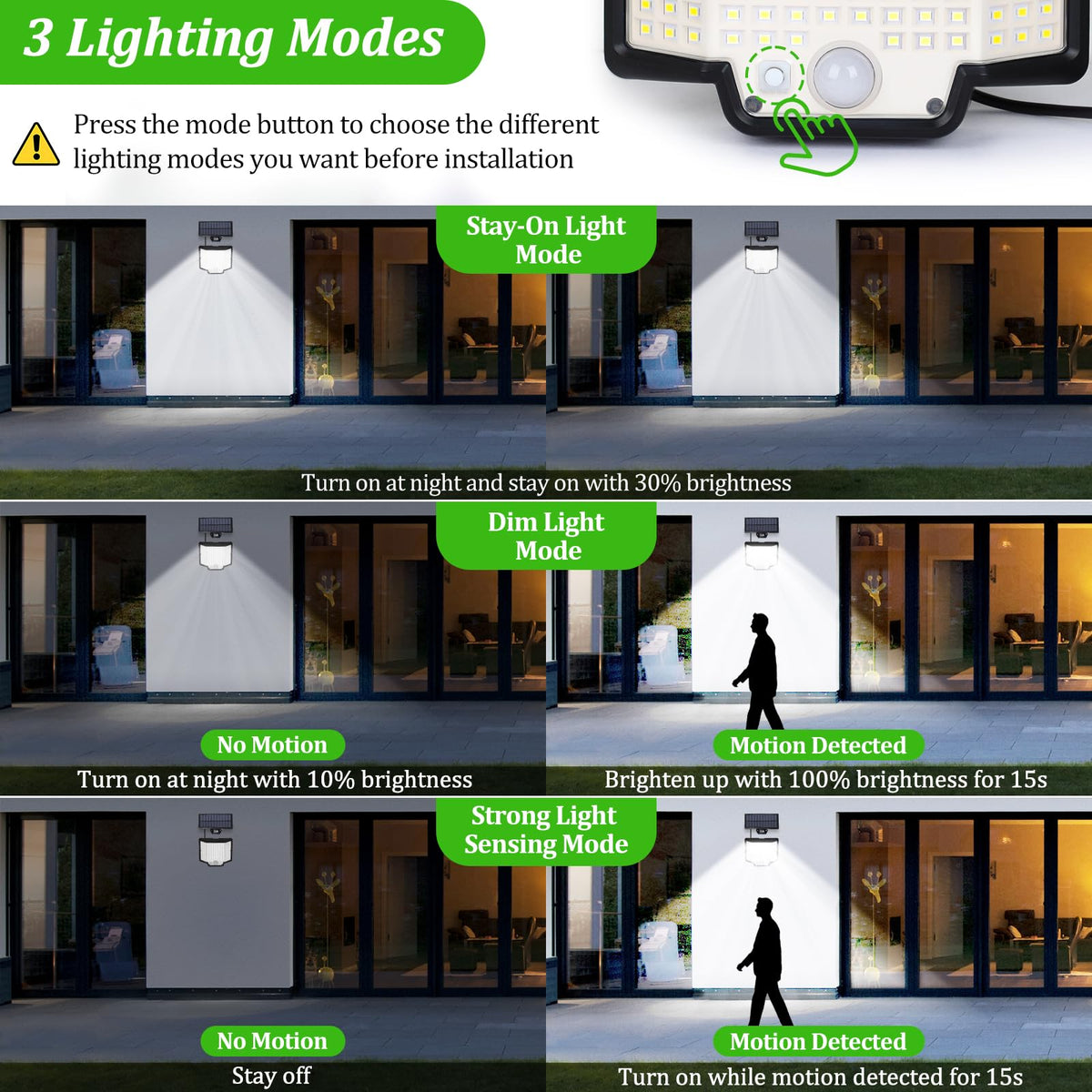 Q: What are the different lighting modes available?A: These solar powered lights offer three lighting modes: Stay-on mode (30% brightness all night), Dim Light Mode (turns on at night with dim light and switches to 100% brightness for 15 seconds upon motion detection), and Strong Light Mode (activates at 100% brightness for 15 seconds when motion is detected).