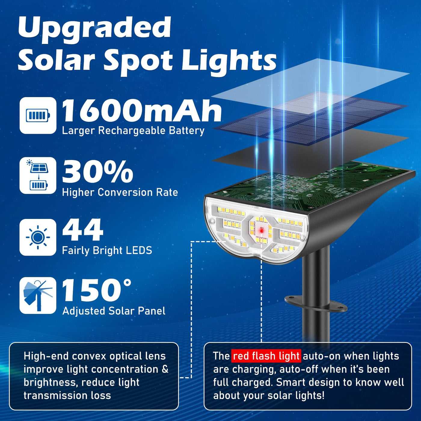 Q: How do I install the solar spotlights?A: The solar spotlights offer two installation options: you can either insert them into the ground using the extendable rod included or mount them on a wall using the screws provided. This versatility allows you to position the lights as needed.
