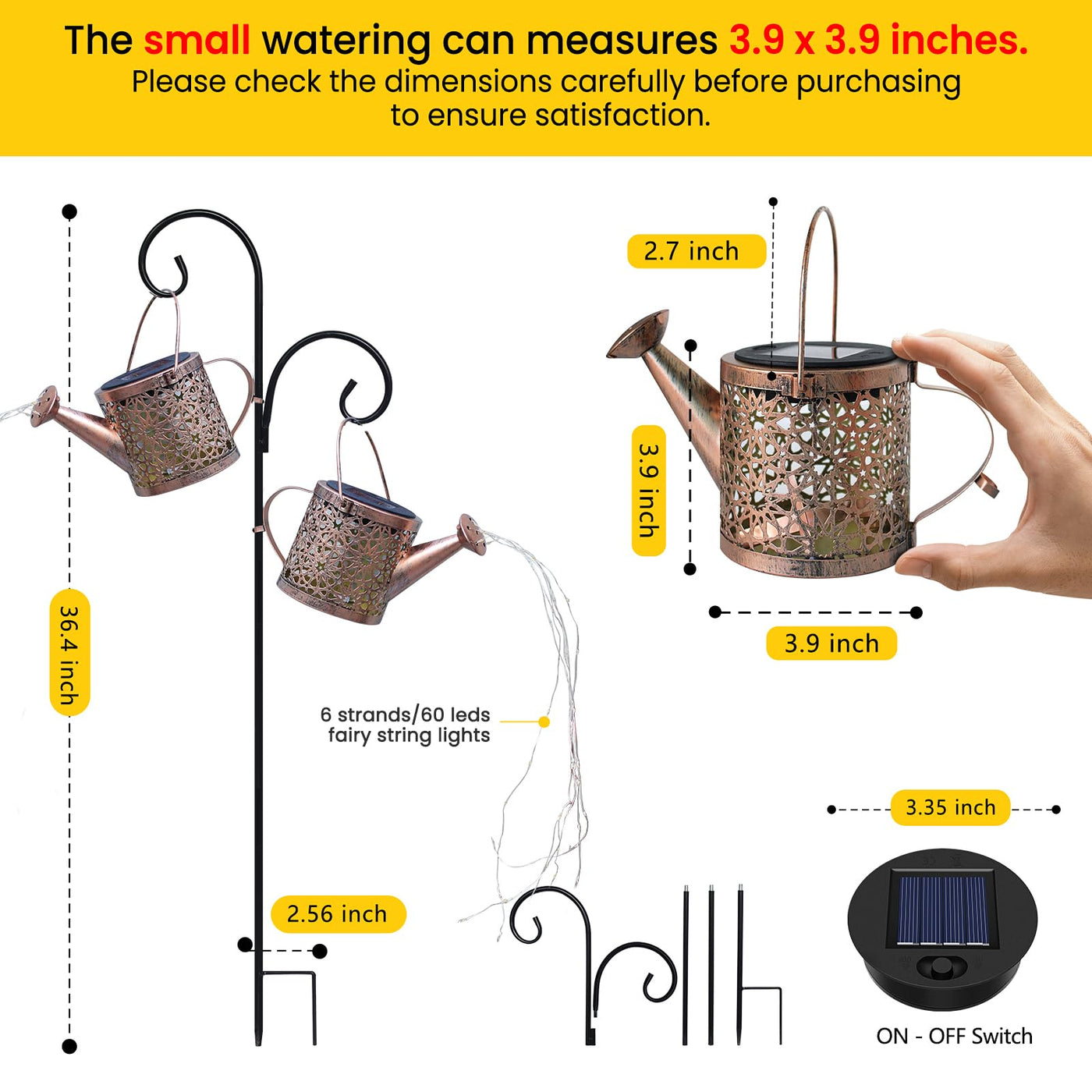 Q: Are these solar watering can lights suitable for all weather conditions?A: Yes, these lights are made of high-quality metal and are IP65 rated, making them rust-proof and suitable for outdoor environments, including rain, snow, and frost.