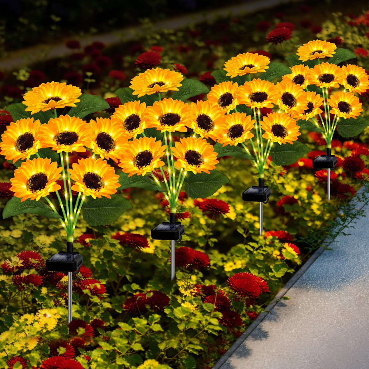 Q: How long do the solar lights last when fully charged?A: After being fully charged for 6-8 hours during the day, the solar sunflower lights can work for more than 12 hours at night, providing prolonged illumination for your outdoor spaces.