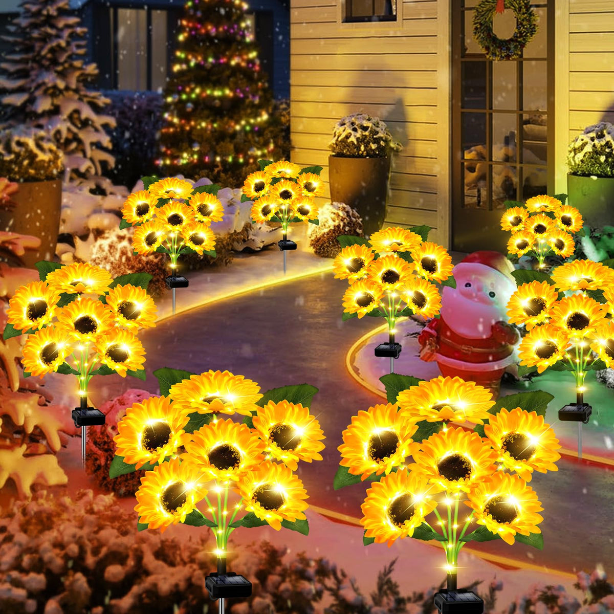 Q: Are these solar lights waterproof?A: Yes, these solar sunflower lights have a waterproof rating of IP65, making them resistant to various weather conditions. They are designed to withstand rain and other outdoor elements, ensuring durability for year-round outdoor use.