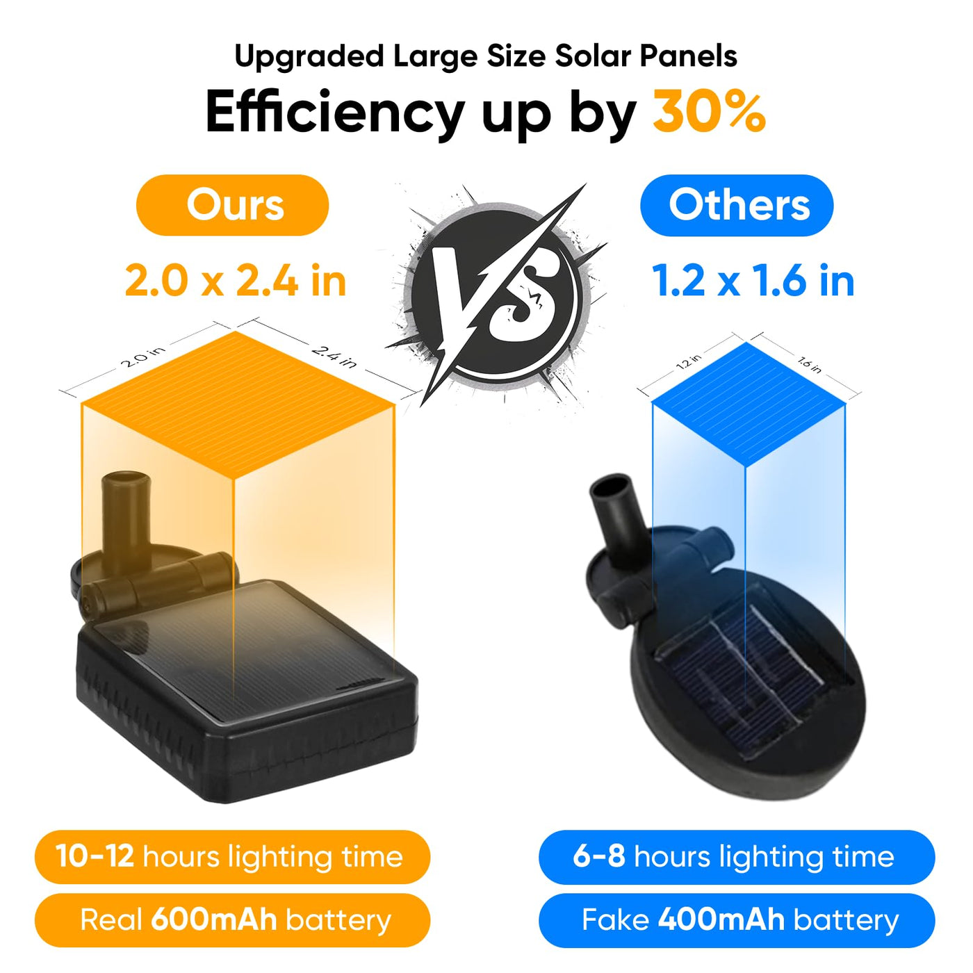 Q: How do the solar lights work and what is the charging time?A: The solar lights are powered by a 600mAh high-capacity battery that charges during the day. Simply install them in a sunny spot for 6-8 hours of charging, and they will provide 10-12 hours of lighting at night.