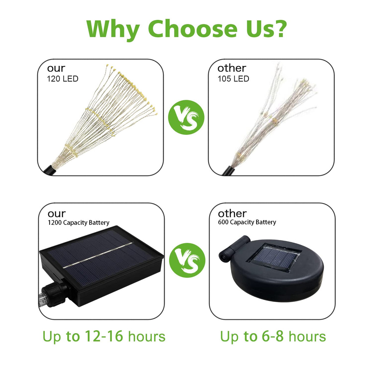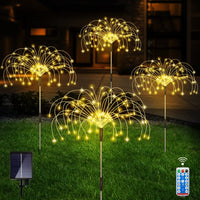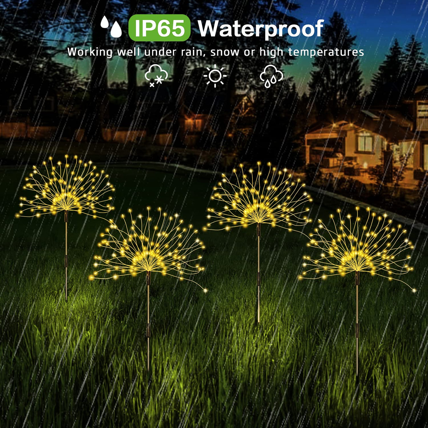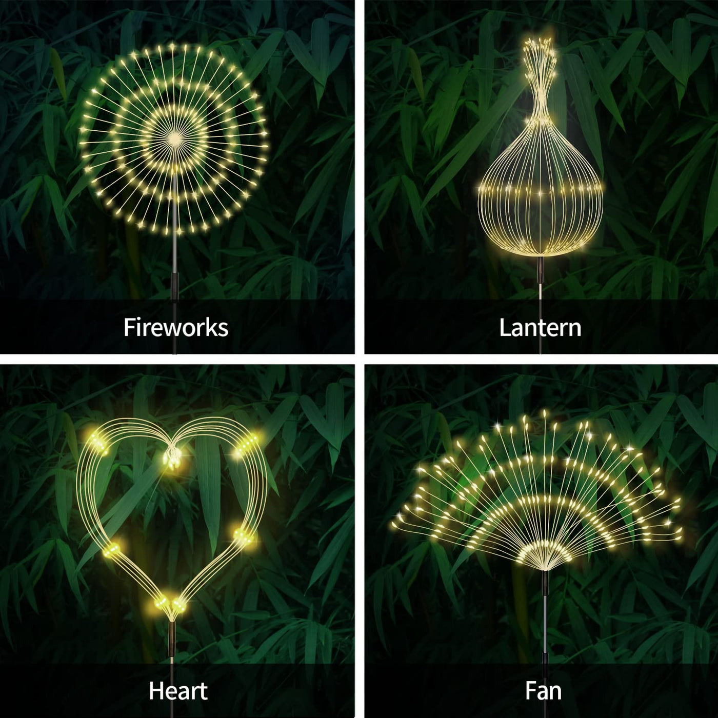 [Upgraded Creative Waterproof Garden Lamp] Each solar yard light adopts 30 flexible high-quality copper wire and 120 led beads, which can be easily bent into any shape you like, such as fireworks, flowers, ferries wheel, and heart shapes. These outdoor ornaments have colorful lights, they illuminate the flower bed, pathways, lawn, driveway, camping grounds, Christmas parties to create a festive and romantic atmosphere. | [Unique Design: Wire Connected-not individual] Compared with other ordinary solar lights outdoor garden, Unihoh adopts the latest design that uses a large-capacity solar panel to provide power for 4 pack solar powered lights, which not only ensure long working time but also reduce transportation cost, which you can enjoy 4 packs of solar outdoor lights at a lower price in Unihoh store. | [Convenient Remote Control] These garden decor solar lights come with a remote control for 8 different flash modes and 3 different brightness levels. Different lighting effect combinations create a magical atmosphere. Build with automatic light sensor function, the sparkler solar lights automatically on at night & off during days. You can also use the remote to set the lighting time for 3/5/8 hours. | [Continuous Lighting For 12~16h] While most brands use 600 capacity battery, Unihoh solar garden fireworks lights are equipped with 1200 ultra-large capacity rechargeable battery, which is able to provide 12-16 hours of continuous lighting after 4-6 hours of full charge while others can only work 6-8 hours. | [Highly Resistant For All Kinds Of Weather] Solar landscape lights are made of durable weatherproof materials and pass the strict air-tightness test. IP65 Waterproof & Dustproof & Heatproof. Solid hard ABS plastic construction can withstand years of rain, snow, frost and sleet as it ensures long-lasting performance under most weather conditions.