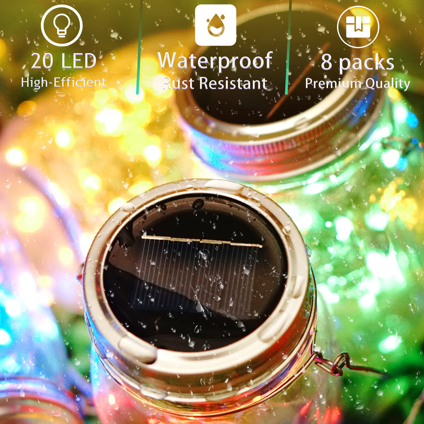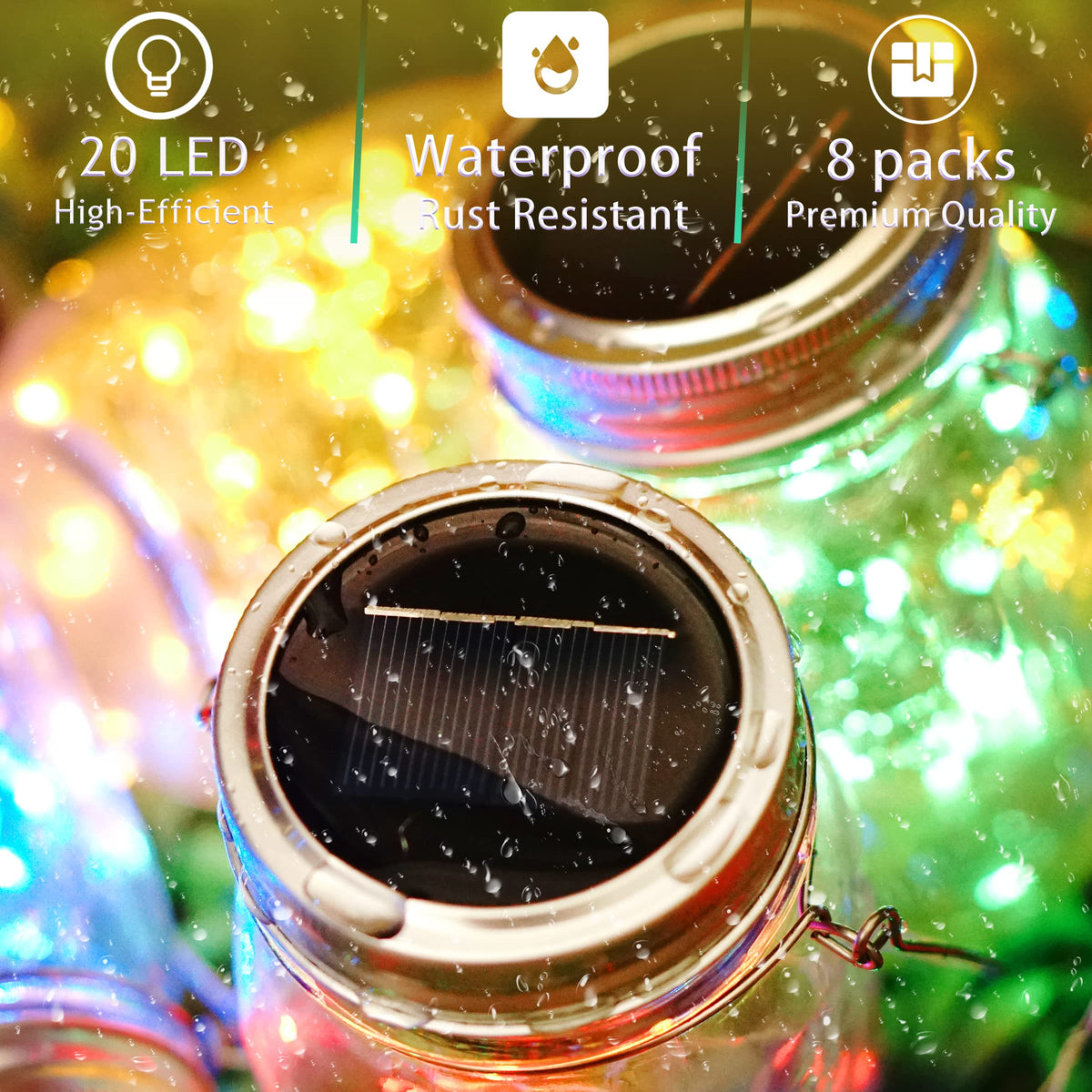Solar Mason Jar Lights [Updated], 8 Pack 20 Led Waterproof Fairy Firefly Jar Lids String Lights With Hangers(No Jars), Patio Yard Garden Wedding Decoration - Multi-Colored