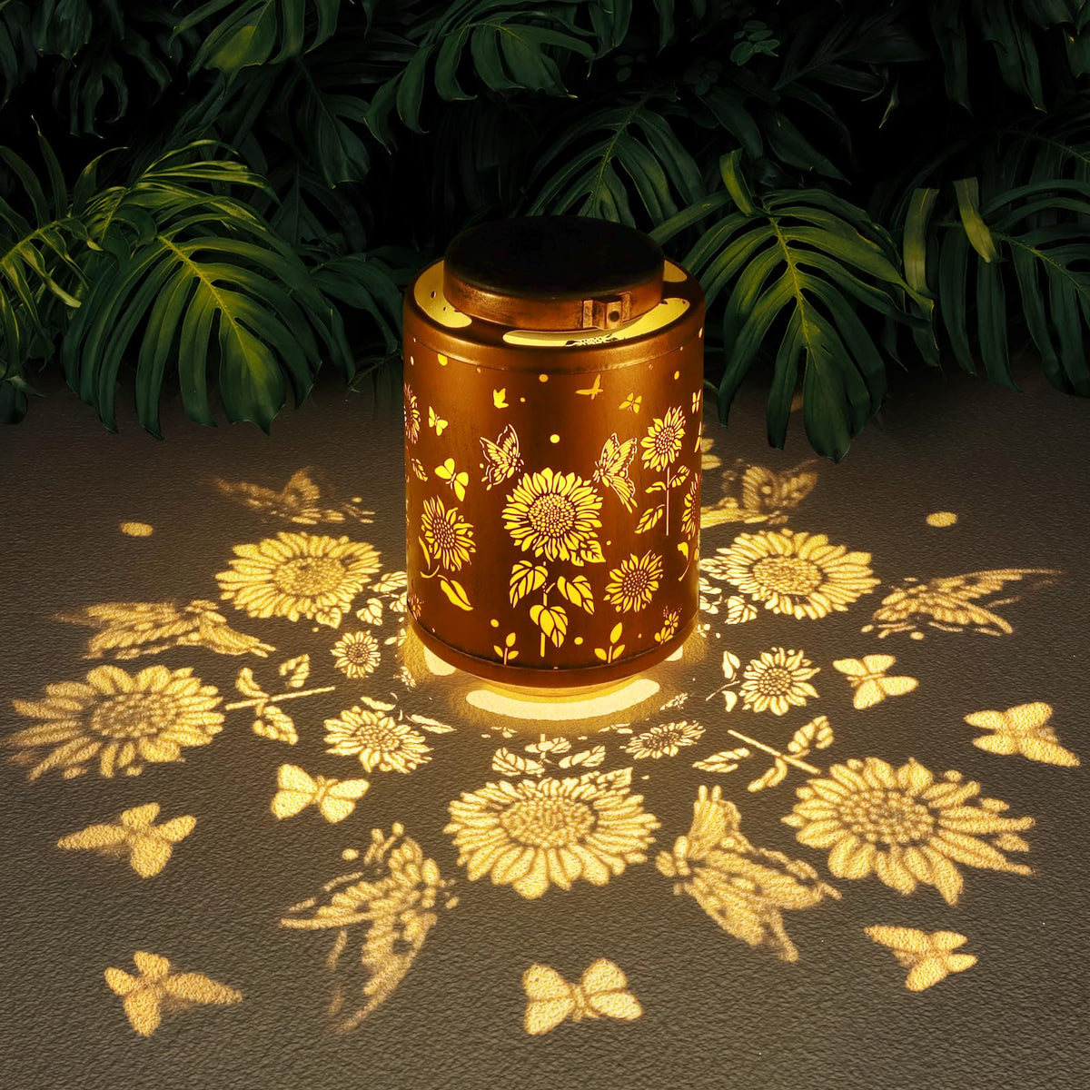 Q: What materials are the solar outdoor lanterns made from?A: The solar lanterns are constructed from high-quality metal, featuring a retro design with a gold copper finish and intricate butterfly patterns, enhancing their aesthetic appeal in any outdoor setting.