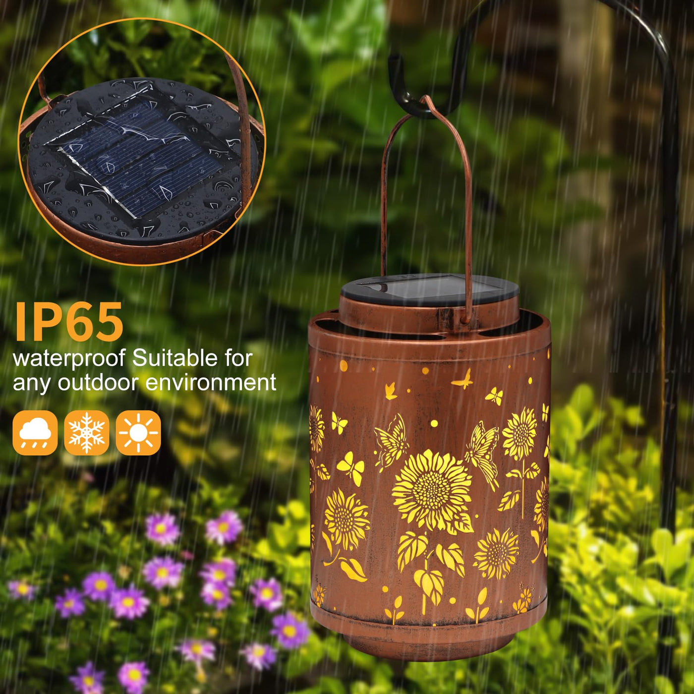 Q: Are these lanterns waterproof and durable for outdoor use?A: Yes, the solar lanterns are designed with an IP65 waterproof rating, making them suitable for outdoor use even in rainy conditions. They are made from sturdy metal, ensuring durability in various weather conditions.