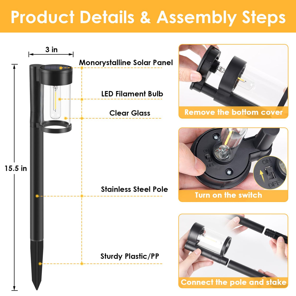 Q: How do I install the solar pathway lights?A: The solar pathway lights are designed for easy installation. Simply use the provided stakes for ground insertion. Make sure to turn on the switch before the first use, and the lights will automatically activate at dusk and deactivate at dawn.
