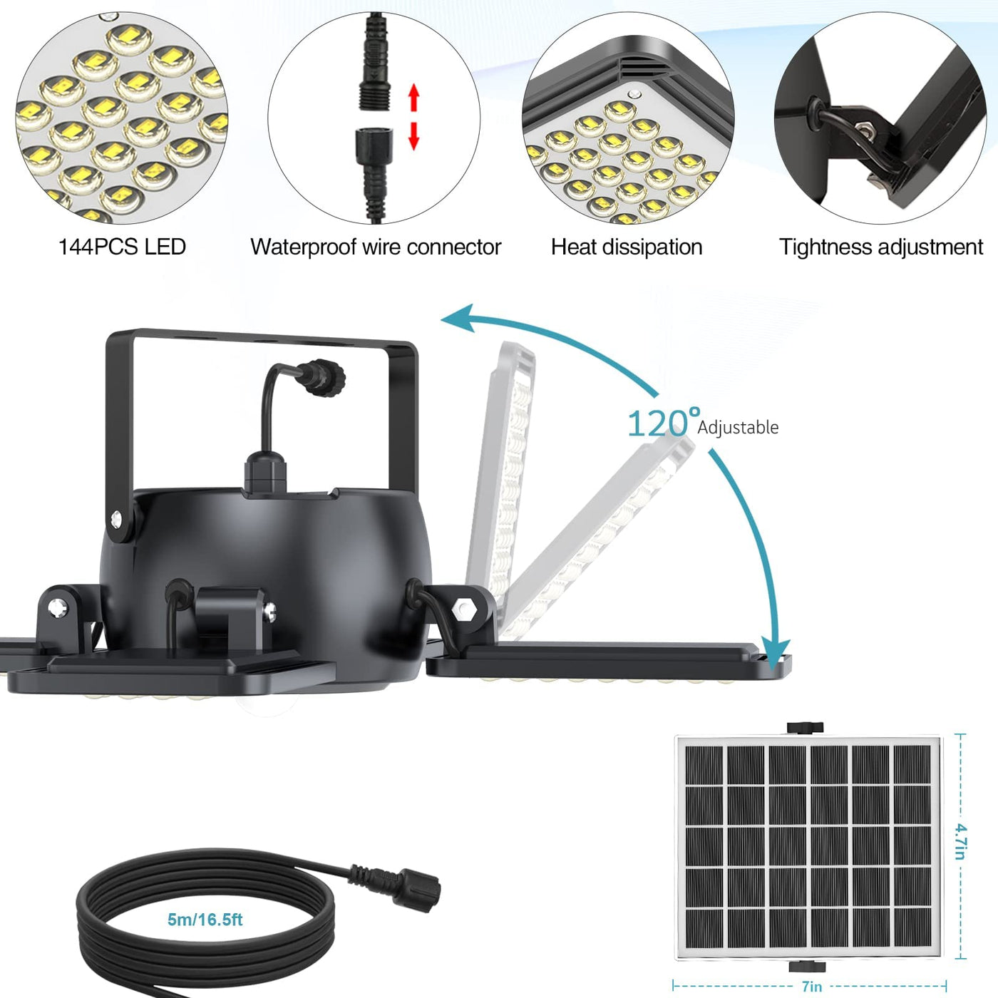 Q: How bright is the Solar Pendant Light and what is its battery capacity?A: This solar-powered light is equipped with 144 super bright LEDs that provide a maximum brightness of up to 1200 lumens. It has a rechargeable battery capacity of 5000mAh, ensuring 8-12 hours of operation after being fully charged with sunlight for 6-8 hours.