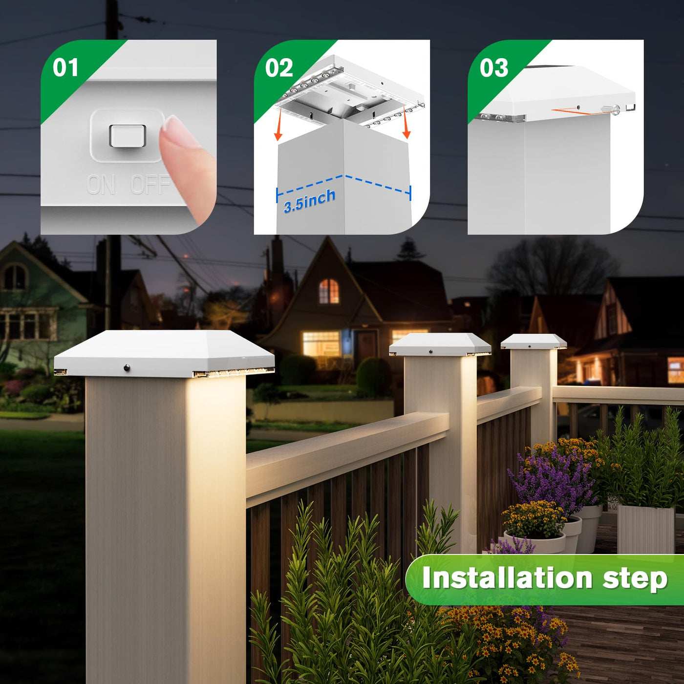 Q: How do I install the solar fence post lights?A: Installation is simple and consists of three steps: turn on the switch, place the light on top of the post, and secure it with screws. The lights will recharge themselves under direct sunlight and automatically light up at night.