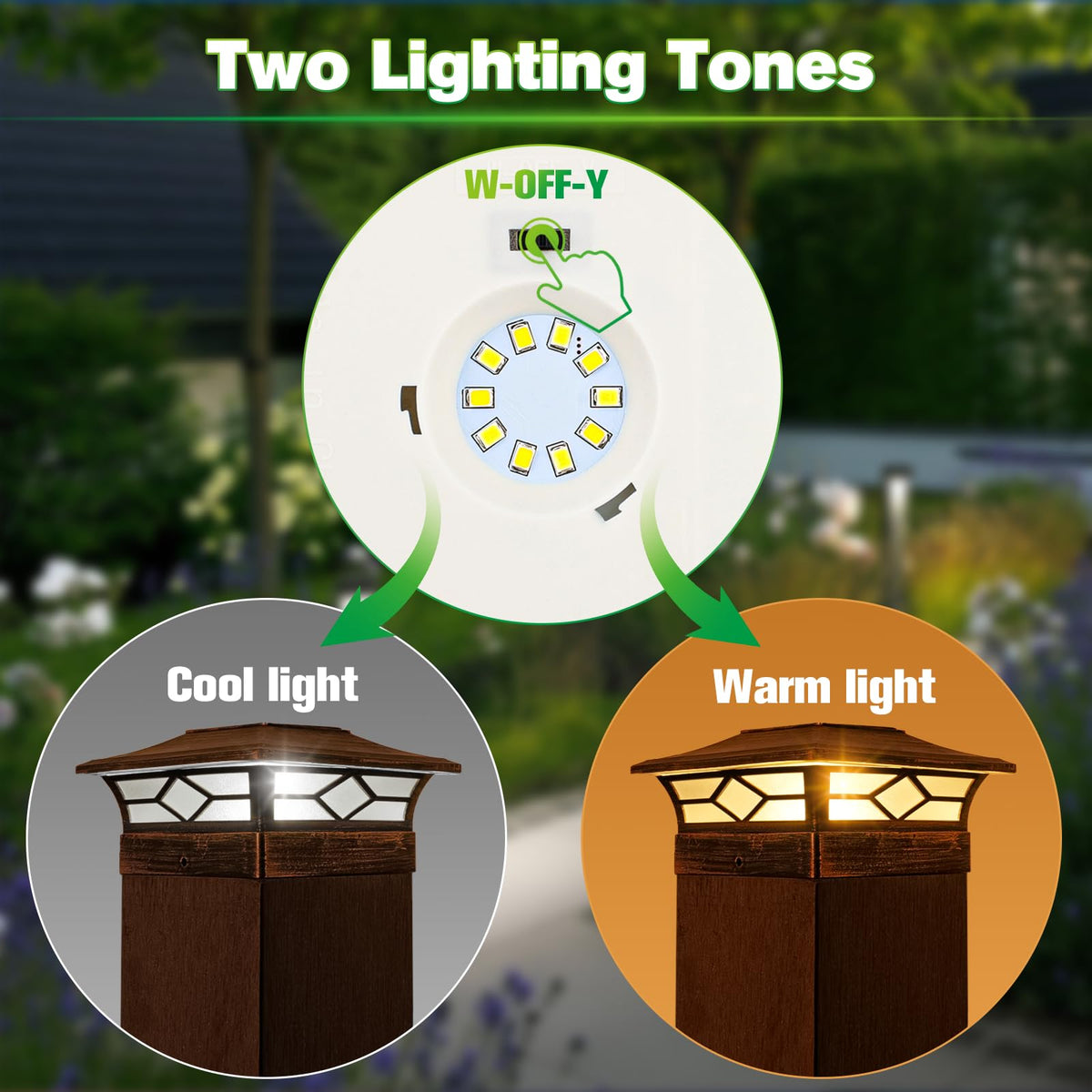Q: How do the light modes work for these solar lights?A: These solar post cap lights feature a two-color mode, allowing you to switch between warm and cool white lighting tones based on your preference and outdoor ambiance.