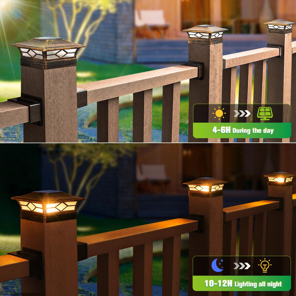 Q: What is the battery life of the solar post cap lights?A: The solar-powered lights charge for 4-6 hours during the day and provide over 10 hours of continuous lighting at night, making them an energy-efficient choice for outdoor illumination.