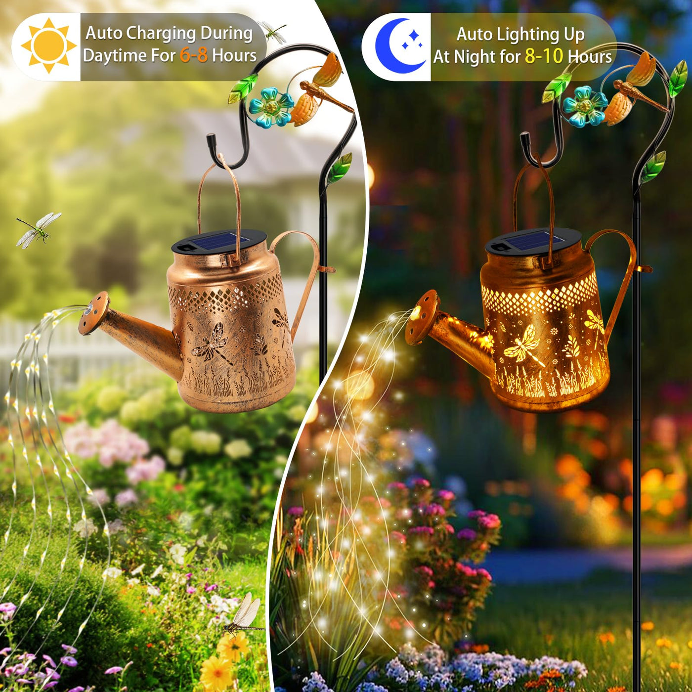 Q: How do the solar-powered watering can lights work?A: The solar-powered watering can lights operate using a built-in light sensor that automatically turns the lights on at dusk and off at dawn. After charging for 6-8 hours in direct sunlight, they can illuminate your garden for 8-10 hours, creating a magical ambiance.