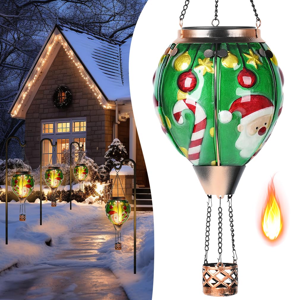 Solar Powered Hot Air Balloon Lantern - Christmas Santa Glass Lantern Simulated Flickering & Dancing Flame Outdoor Hanging Yard Light Waterproof Ip65 For Patio Lawn Porch Xmas Decor Gift