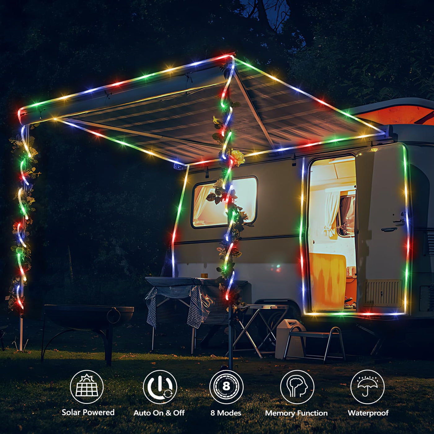 Q: How do the solar rope lights work?A: The solar rope lights are powered by a built-in solar panel that absorbs sunlight during the day to recharge. They automatically turn on at night after being fully charged for 6-8 hours, providing illumination for 12-15 hours without any extra electricity cost.
