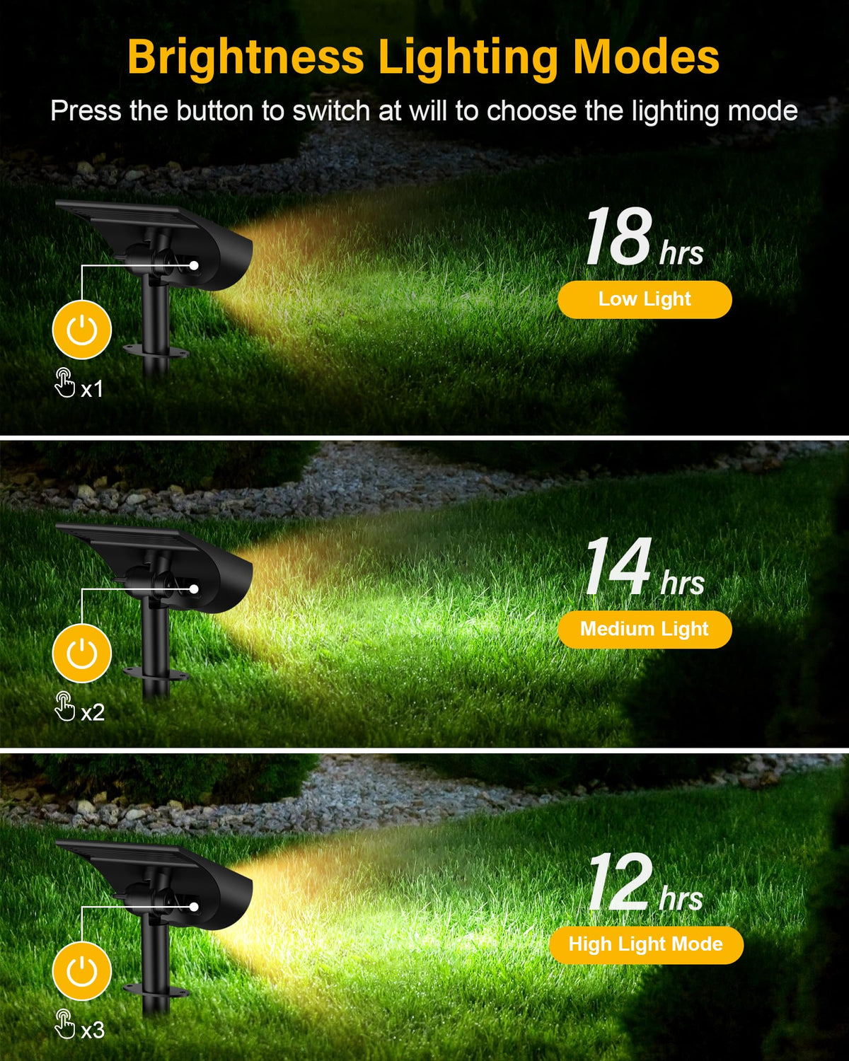 Q: Do the solar spot lights have adjustable brightness?A: The solar lights come with three brightness settings, allowing you to choose between low, medium, and high light modes. However, brightness is not adjustable in flash mode.