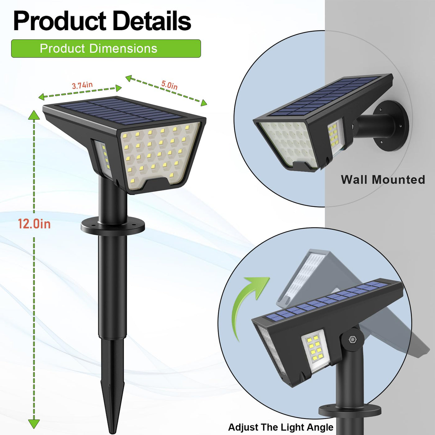 Q: Can the angle of the solar panel and light be adjusted?A: Yes, the solar spotlights offer a 270° adjustable angle for both the solar panel and the lights, enabling you to optimize sunlight exposure and lighting direction.