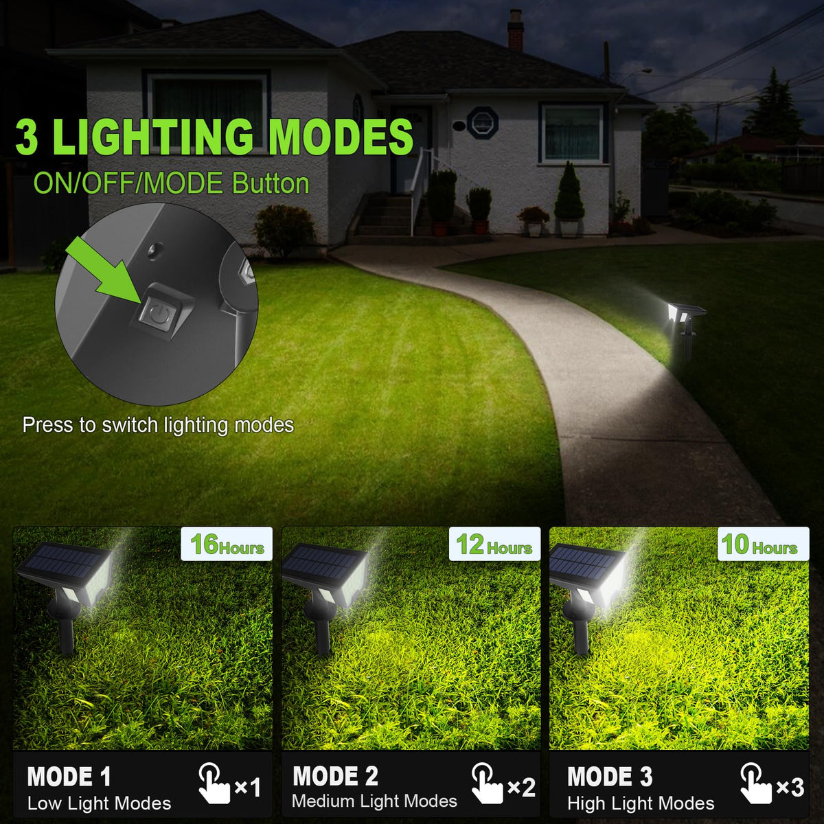 Q: What are the different lighting modes available in these solar spotlights?A: The solar spotlights feature three adjustable lighting modes: High brightness (up to 8 hours), Medium brightness (up to 10 hours), and Dim brightness (up to 12 hours), allowing you to customize the light according to your needs.