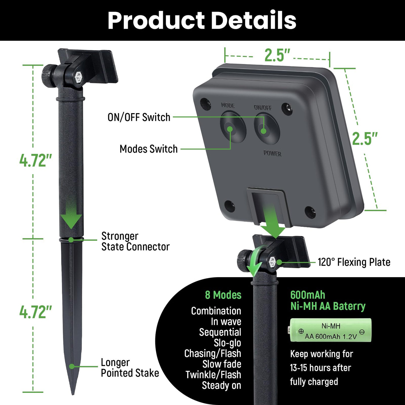 Q: What lighting modes do the solar string lights offer?A: These solar string lights feature 8 distinct lighting modes, allowing you to customize the ambiance from gentle twinkling to steady lighting for various occasions.