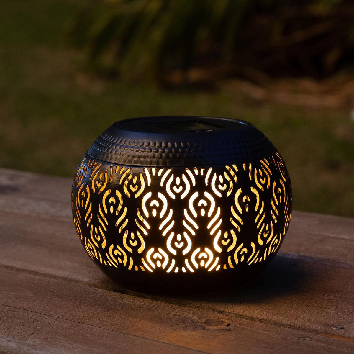 Q: What is the design of the Solar Table Lantern?A: The Solar Table Lantern features a unique Dancing Flickering Flame design, crafted with a black peacock feather metal finish that adds a retro and elegant touch to any setting.