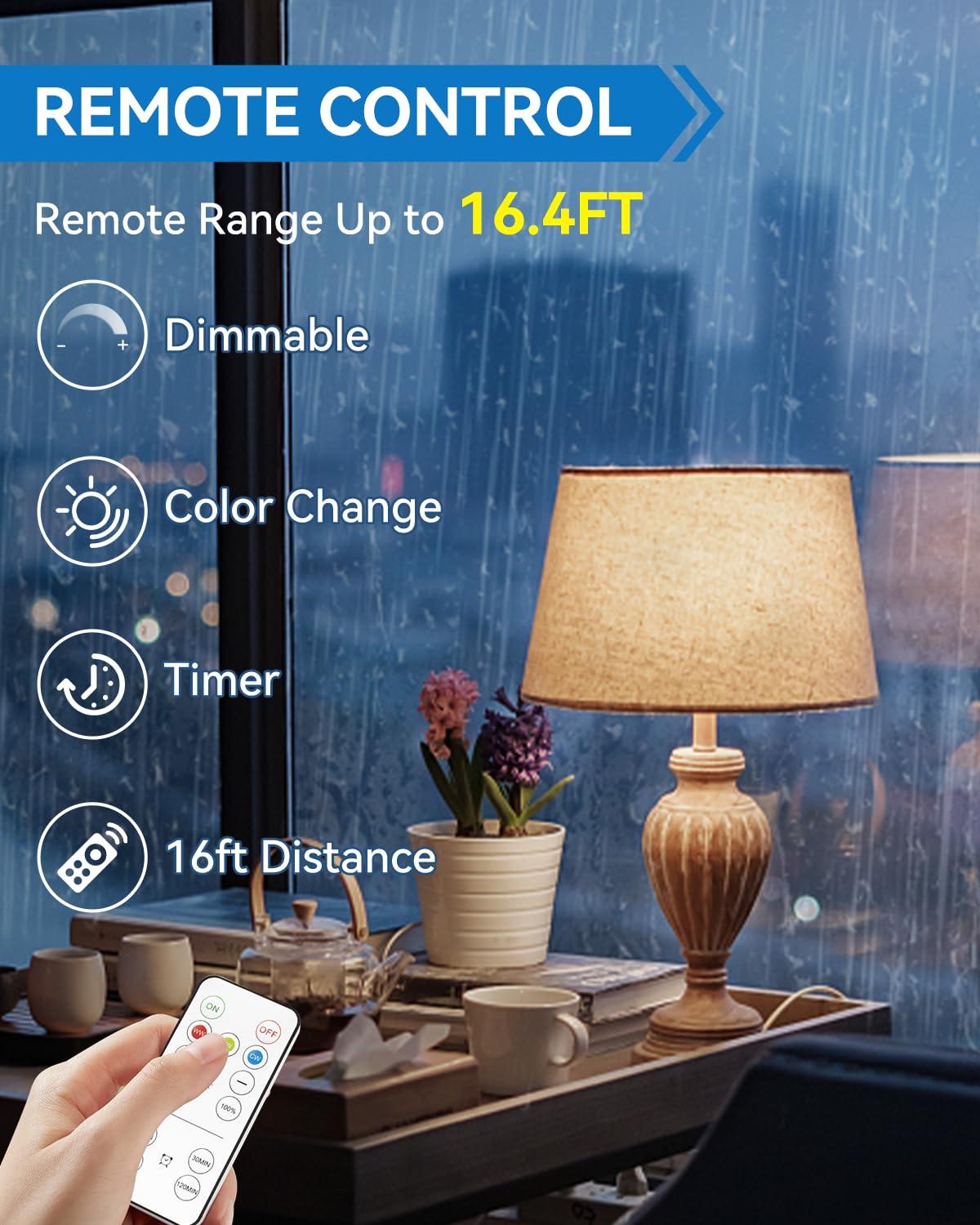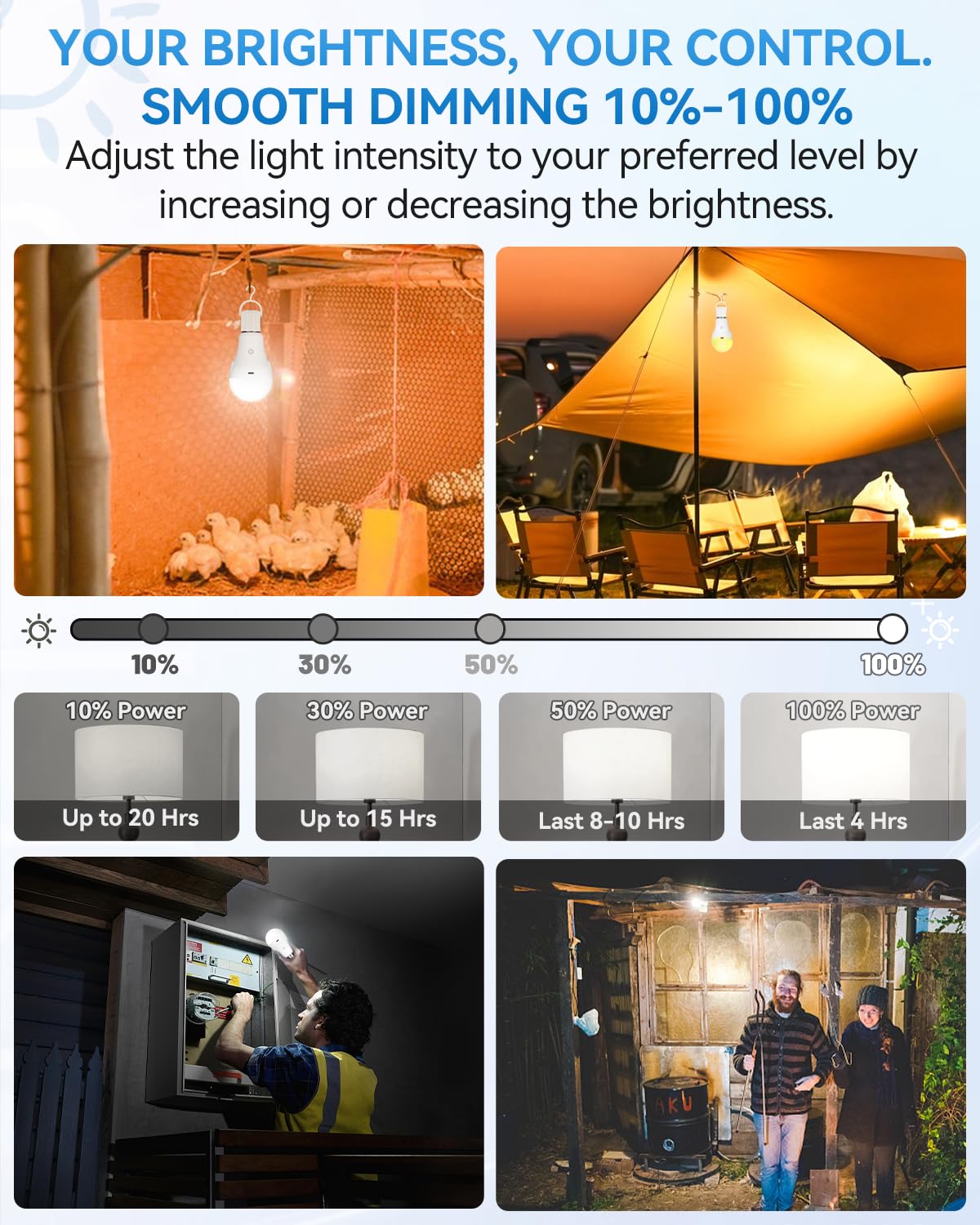FREQUAENTLY ASKED QUESTIONS & ANSWERSQ: How the Battery Operated Light Bulb Charges? A: This battery light bulb can charg by lamp socket and usb-c cableQ: Can I replace the battery myself if it gets damaged after long-term use?A: The battery cannot be replaced by the user.Q: How can I use the timer function? A: To use the timer function,press the timer button first, and then adjust the color temperature and brightness using the corresponding remote control buttons as needed.Q: Can I use it on wire-free lamp fixtures? A: Yes, this battery bulb has a built-in 1200 mA rechargeable battery and can be used on E26/E27 lamps without hard-wires. It can only be operated by touch function and remote control. Can also be used on light fixtures with hard wires,only rechargeable via USB.Q: Can I purchase a replacement remote control if it gets lost?A:Replacement remote controls cannot be purchased independently. Please contact customer service to purchase the corresponding model of remote control.Product SpecificationsVoltage: 85-265V 50/60HzSize: A19 Color temperature: 3000K/4000K/6000K &6 RGB ColorDimmable: 10%-100%Time Set: 60/120 MinutesPower: 15WLumen: 700LM-800LMBattery capacity: 1800mahColor rendering index: > 85Charging Time: 4-5 Hours Working Time: Enjoy up to 2 hours of intense brightness or up to 50 hours of continuous use at the lowest setting.Control Way: Remote Control & Touch ControlPackage includes2* Battery Light Bulb1* Remote Control 1* Charging Cable 2* Hook