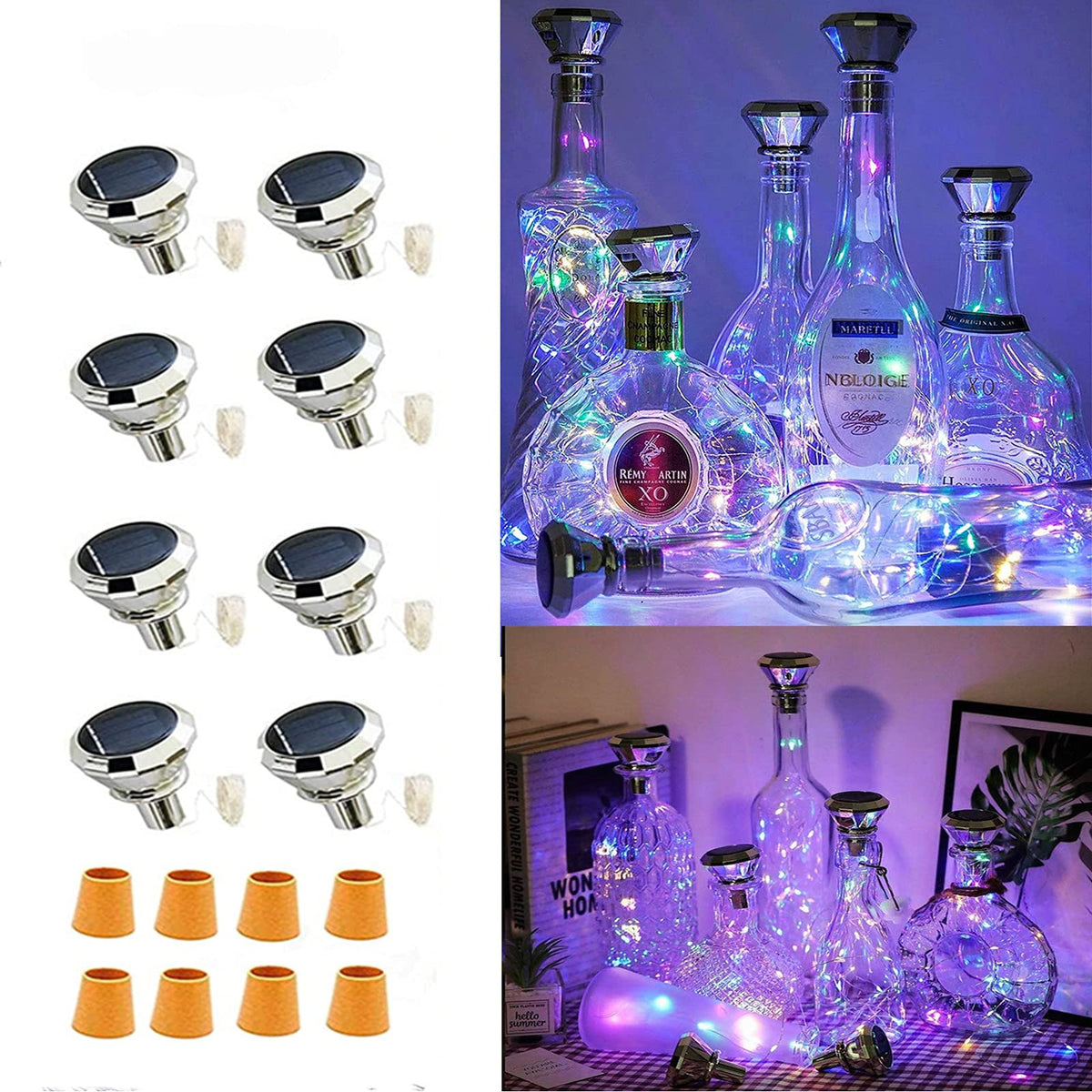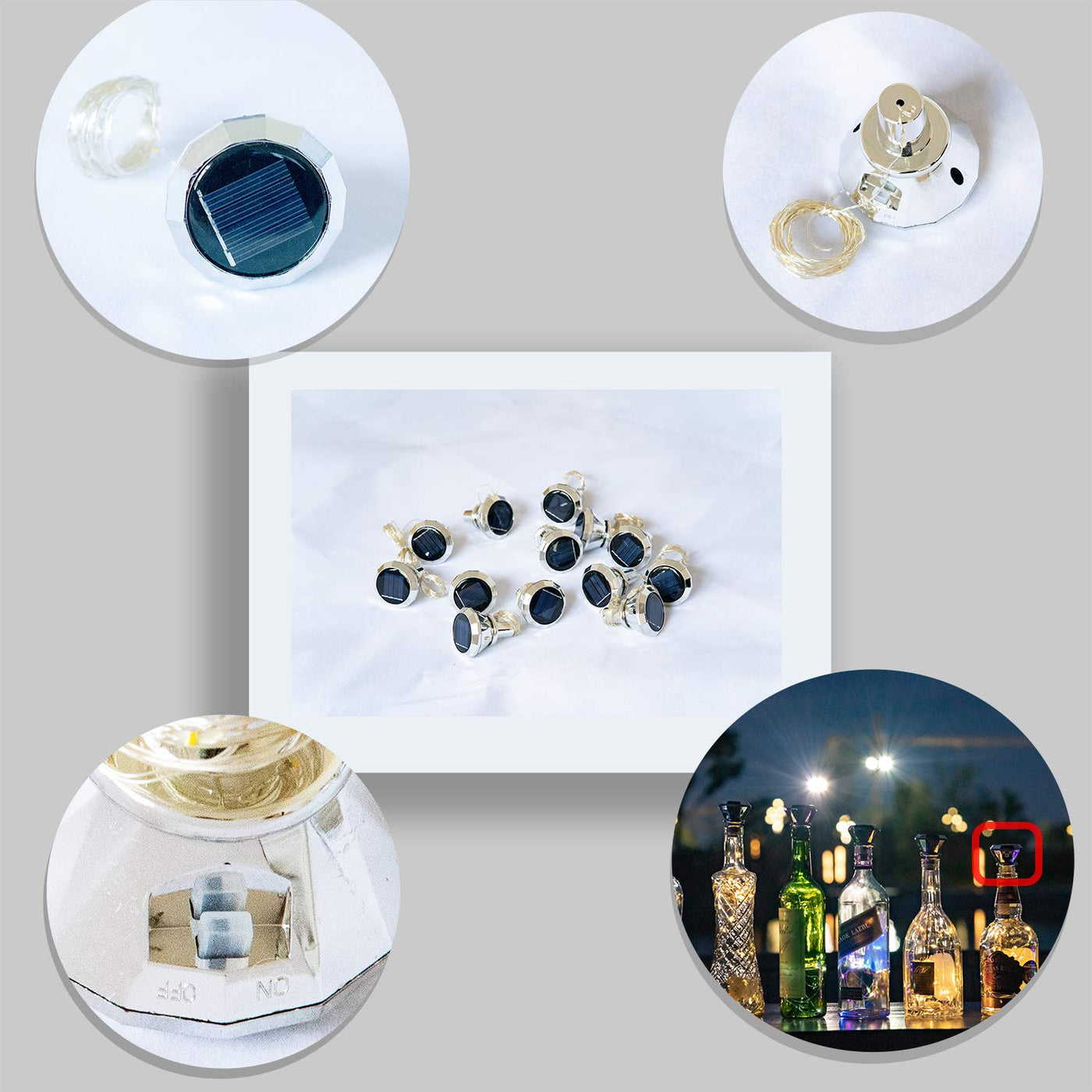 No Battery Needed, A solar panel on the top, 100% solar powered. The solar bottle lights have high brightness, low radiation and no pollution. Charge in the sun 5-6 h will light up 8-10 h. Slide the switch to the ''ON'' position; Long lasting LED bulbs, little heat, safe to handle even after long-time use.