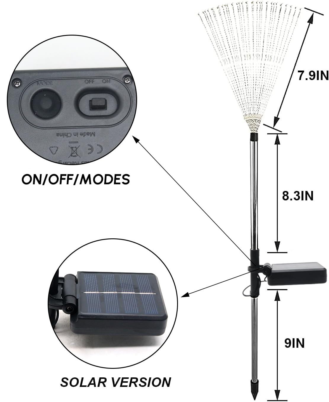 120LED is more beautiful than 105 LED firework lights These solar lights for outside yard decoration add a sense of novelty and romance. Number of Led lights: 120 LED lights Material: stainless steel, plastic PP, ABSIP65 This LED outdoor firework light is waterproof and dustproof, perfect for outdoor use Rubber protection switch-against moisture and dust. Protection level: IP65 The solar firework lights outdoor waterproof made with durable copper wires and low-heat-emission 120 LED bulbs, it's not easily broken or overheats after using several hours.Built-in 1.2V/800mAh AAA Ni-MH rechargeable battery. Solar panel: 2V, 140mA Standard sunshine charging 6-8 hours at daytime, working 8-10 hours at night after fully charged. Weight: 314g/0.69lb Package Size: 38x7x6cm/15x2.8x2.4inchNo tools required, easy to install. Step 1Please push the switch to “ON”.Step 2Installing two parts together.Step 3Inserting firework lights into the ground.Step 4The fireworks lights will automatically turn on at night. With red, white, blue, yellow and green flashing leds is great garden decor choice for Christmas, Mother's Day, Valentine's Day, Thanksgiving, birthday parties, dates and other holidays to dress up the yard, garden, path, fence, etc.. Trouble Problems: If your solar light dose not turn on at night, it may be caused by one of the following conditions. 1. Make sure the solar panel is able to direct sunlight and charge efficiently. 2.A dirty solar panel will not allow the battery to full charge. Please clean regularly with a cloth. 3.Push the ON/OFF switch to the "ON" position when you charge during the day.(Make sure charge in sunlight about 8-10 hours. Attention Hold the solar panel by hand when dismantling the fireworks lights to avoid the wires being pulled out.