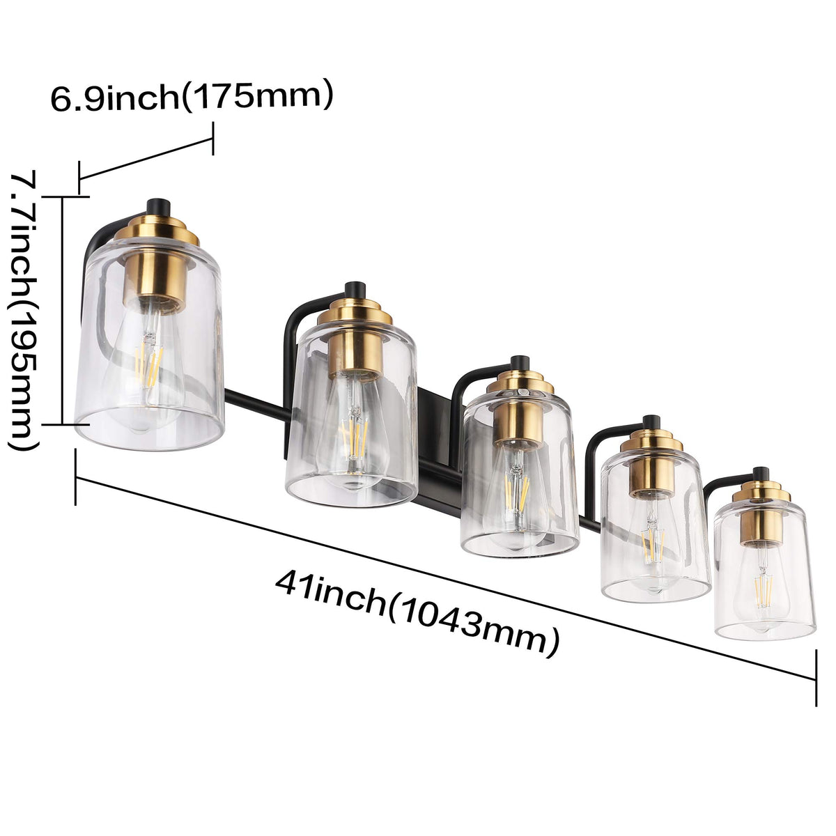Brand: SOLFART LIGHTING Specification: 1. Length 41'' x W7.7'' x Height 6.9'' ( L1043*W195*H175mm ) 2. Power: MAX 60W / each socket ,E26 Socket (Not include the bulb,Please purchase separate) 3.Input: AC 110V ,50/60Hz 4.Light color: According to the bulb you purchase 5.Material: Transparent Glass lampshade +Matt Black Frame with bronze fixtures. Without Any Welding Defects. 6.Easy to install : 1 Set Complete Package, Need to assembly the shade only ,No Switch No plug On the Lamp.Suitable US Junction Box Standard. Package: 1 pcs complete wall light + 1 set of screw. installation instruction included. Certified: CE , ROSH ,VED,CQC ,(without IR and UV radiation)