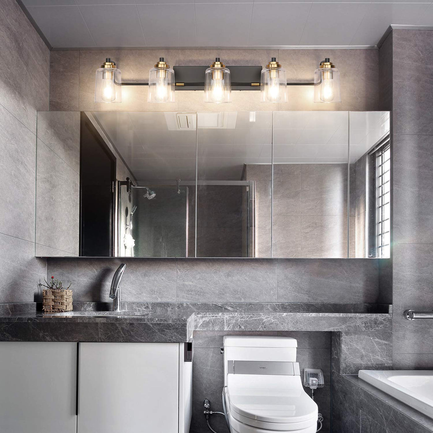 Solfart Vintage Vanity Lights For Bathroom 5 Light Bathroom Vanity Light Black Metal With Clear Glass Brass Fixtures Wall Mount