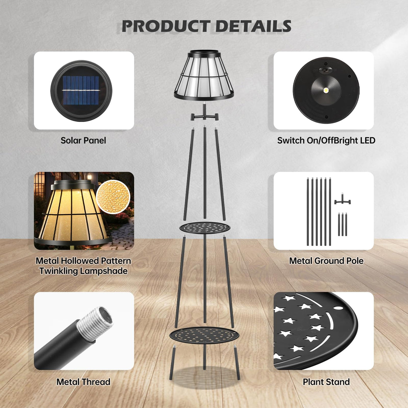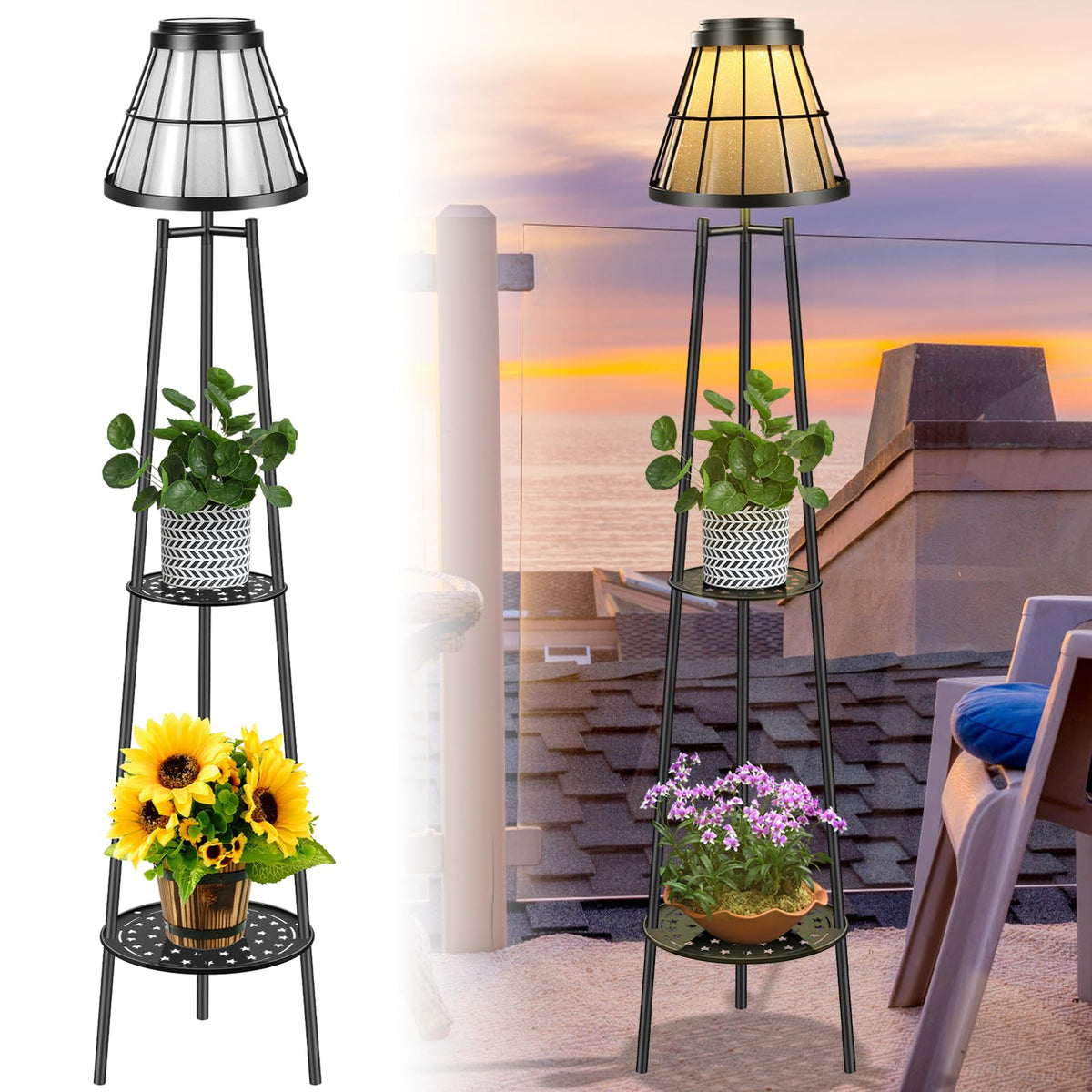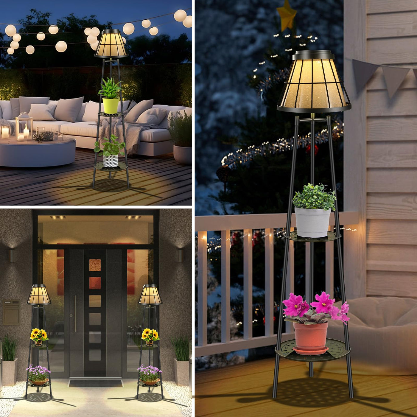 Solgicar 45.4'' Metal Outdoor Floor Lamps With 2 Plant Stand, Solar Lights Plant Stand, Waterproof Solar Lantern Lights For Patio Deck Yard Garden Porch - Black