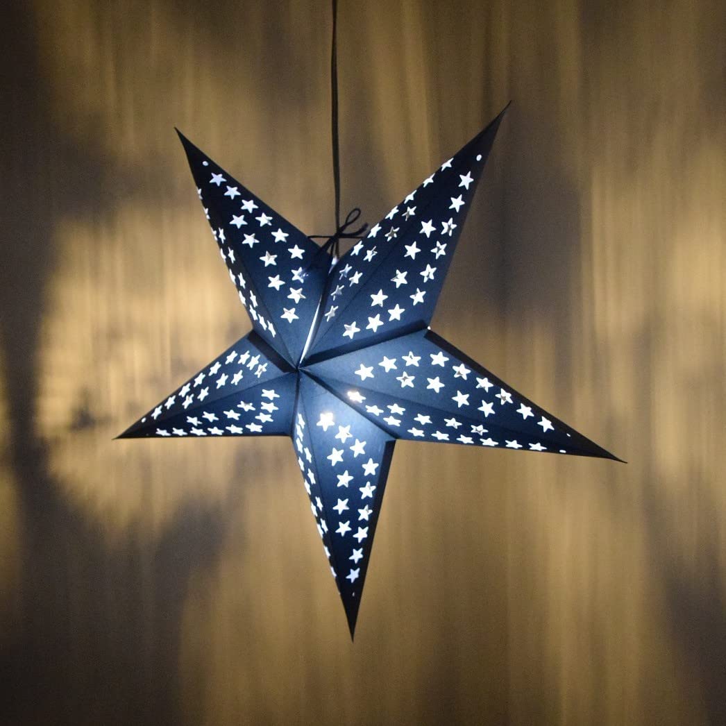 Take The Stars From The Night Sky Into Your Home! Add Unique Illumination With Our Decorative Paper Star Lights. We Have Over 70 Styles Of Paper Star Lamps Perfect For Any Occasion Including Christmas And Diwali. Suspend A Couple Of Paper Star Lights From Your Living Room Ceiling And Admire The Glimmer Of Little Lights Cast On The Walls. Dangle A Paper Star Lantern In Your Favorite Window And It Will Appear To Fall From The Sky. Paper Lampshades Make Great Home Decorations. Specifications This Solid Blue Paper Star Light Features A Multitude Of Star Cutouts For A Dazzling Effect. White 12 Foot Standard Power Cord With On/Off Switch Included Paper Star Lights Are Shipped Flat With Clear Instructions For Easy Assembly The Folded Paper Light Expands Into A 3 Dimensional Star Assembled Star Is 24 Inches Wide By 10 Inches Deep All Of Our Paper Star Lights Are Handmade In India And Are Eco-Friendly Lights Safely Accept Up To A 40 Watt Standard Light Bulb Going Green? Substitute An Energy Saving Led Bulb For A Standard Bulb Over 70 Unique Styles Available Genuine Hometown Evolution, Inc. Product