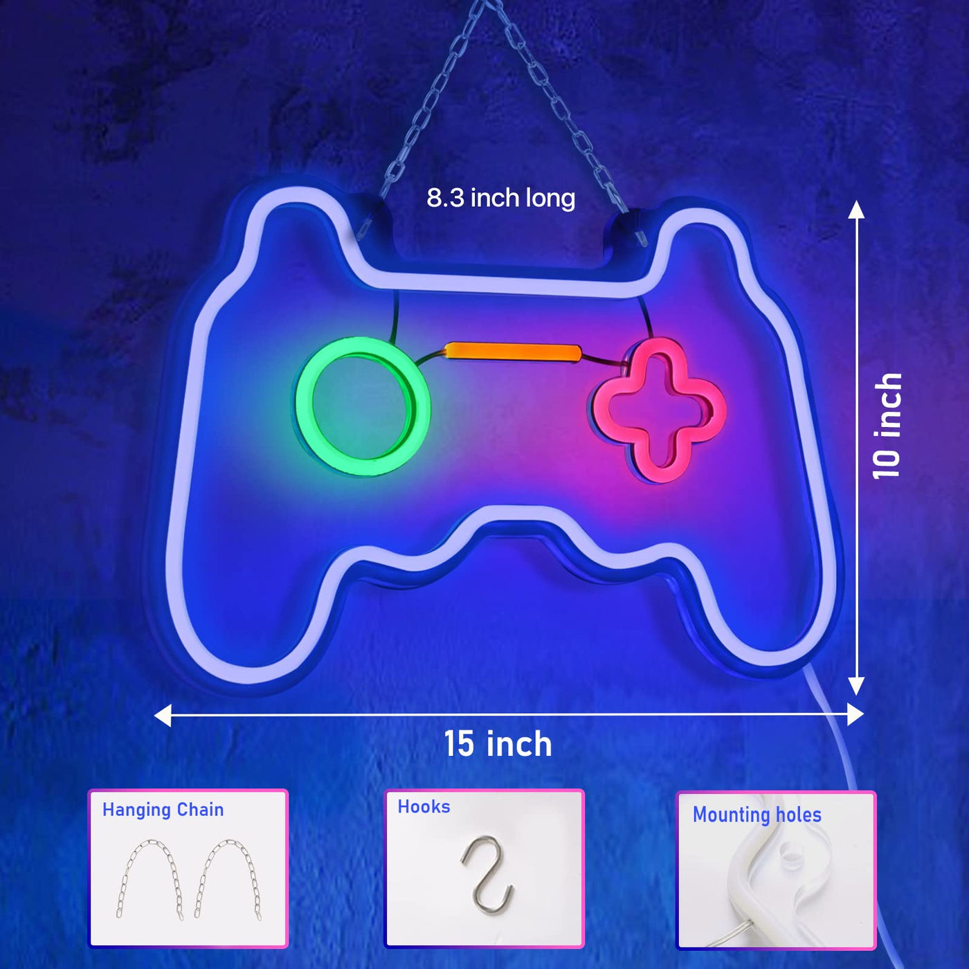 Why choose our LED Neon Signs Light Light up your room with game neon sign game console light LED flexible neon tube and sturdy acrylic backboard, long lifespan and energy saving night neon sign A perfect neon decor sign to create warm and romance atmosphere for your sweet bedroom, kids room, boys game room, etc Dimension: 14*9 in Power: Dc 5V Type of Bulb: LED cord Length: 59 inches Materials: Acrylic board + Silicone hose Switch Function: Turn on, off or dimmer Plug Type: Standard USB Plug compatible Power Source: Power Bank, Phone charger, USB Socket, computer USB etc Attention: 1The blue neon light can not be used as daily lamp 1This lights is not waterproof DonAt store or use it in damp environment or in other outdoor lighting 2Before installing or moving it, cut off the power supply first Dont touch it with a wet hand when it is working 3Do not switch off the power supply by pulling the cable as may cause damage or short-circuits 4Measured manually, the color and size may not completely as the picture shown 5Store the night light in a cool and dry place if product is not to be used for a long time