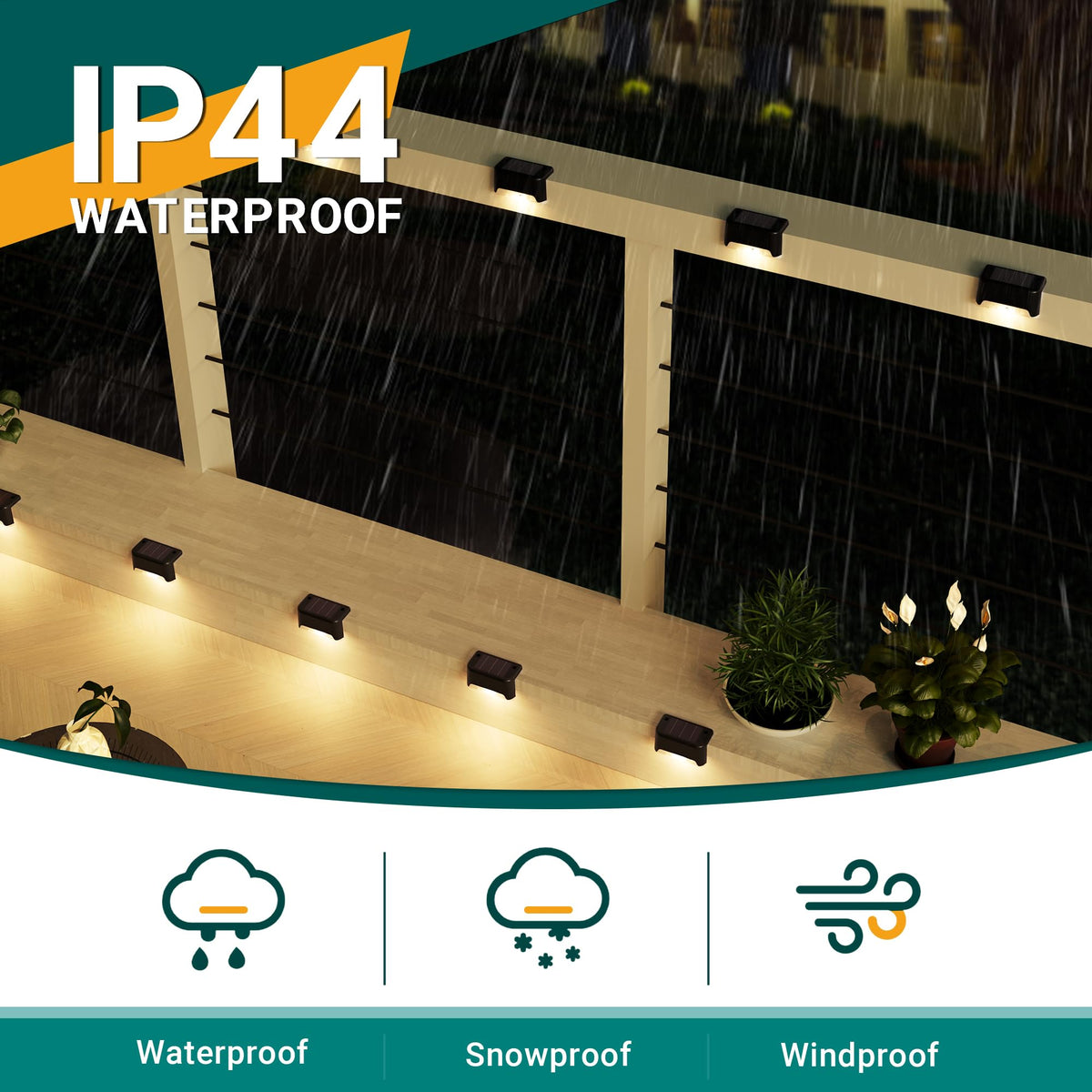 Q: Are these solar lights waterproof?A: Yes, the SOLPEX solar deck lights are designed with a hard ABS shell and high-quality solar panel, making them waterproof and able to withstand rain, wind, and light snow.