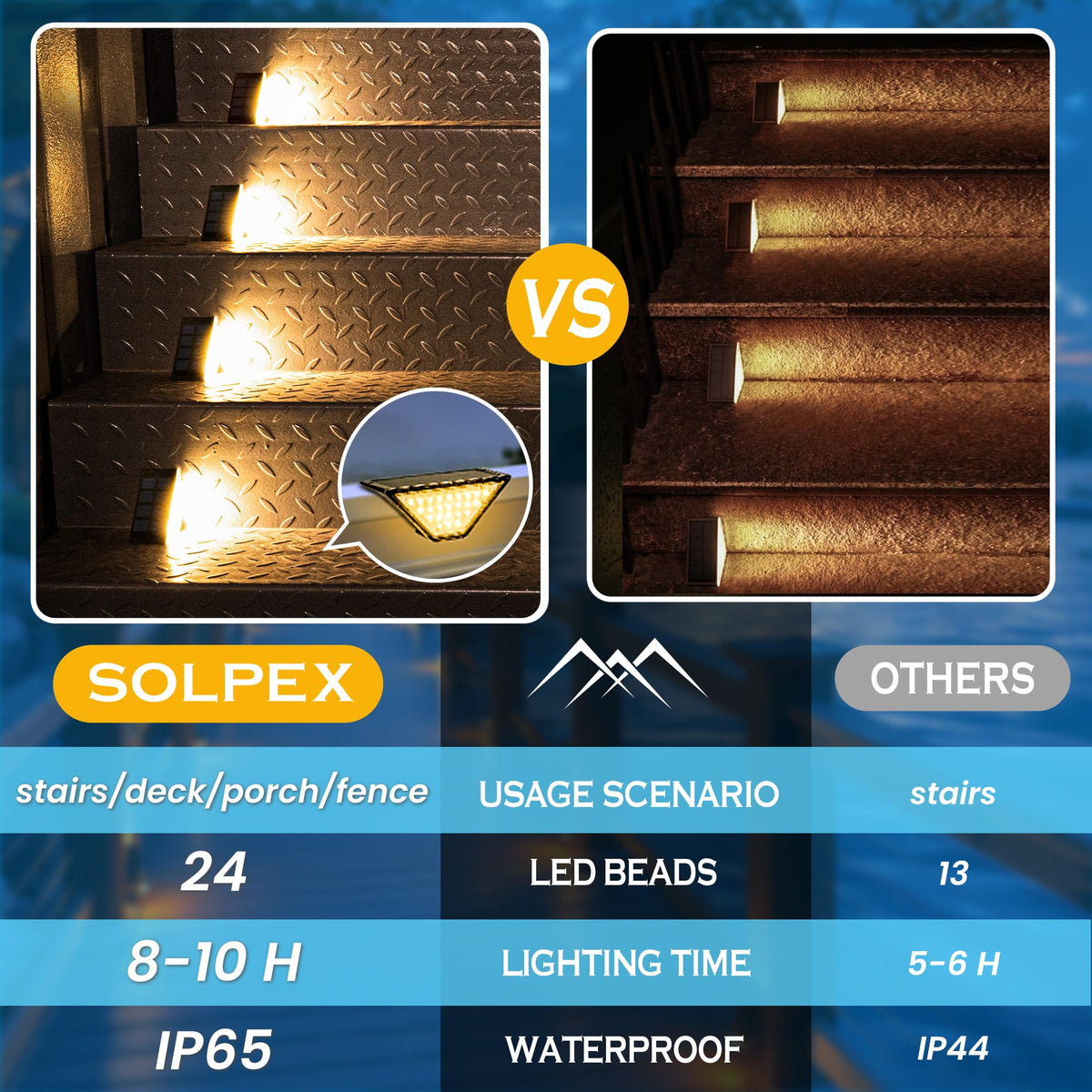 Q: What is the brightness level of these solar step lights?A: The SOLPEX Solar Step Lights feature 24 LEDs, providing super bright illumination that ensures safety for kids, elderly, and pets while creating a warm atmosphere.