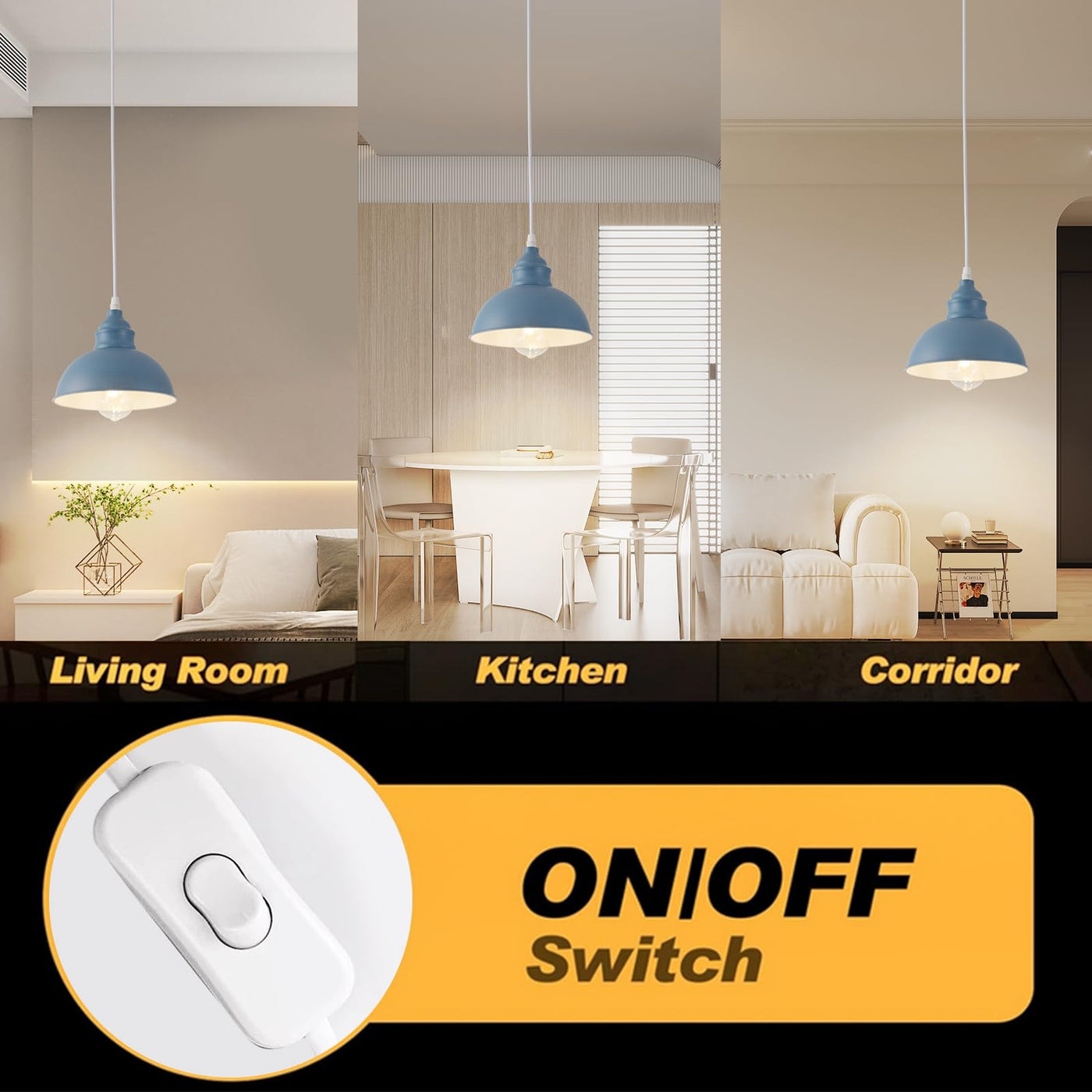 Q: Does the pendant light come with an on/off switch?A: Yes, the SoodMi Plug in Pendant Light includes an on/off switch on the cord for easy operation. This feature adds convenience for daily use.