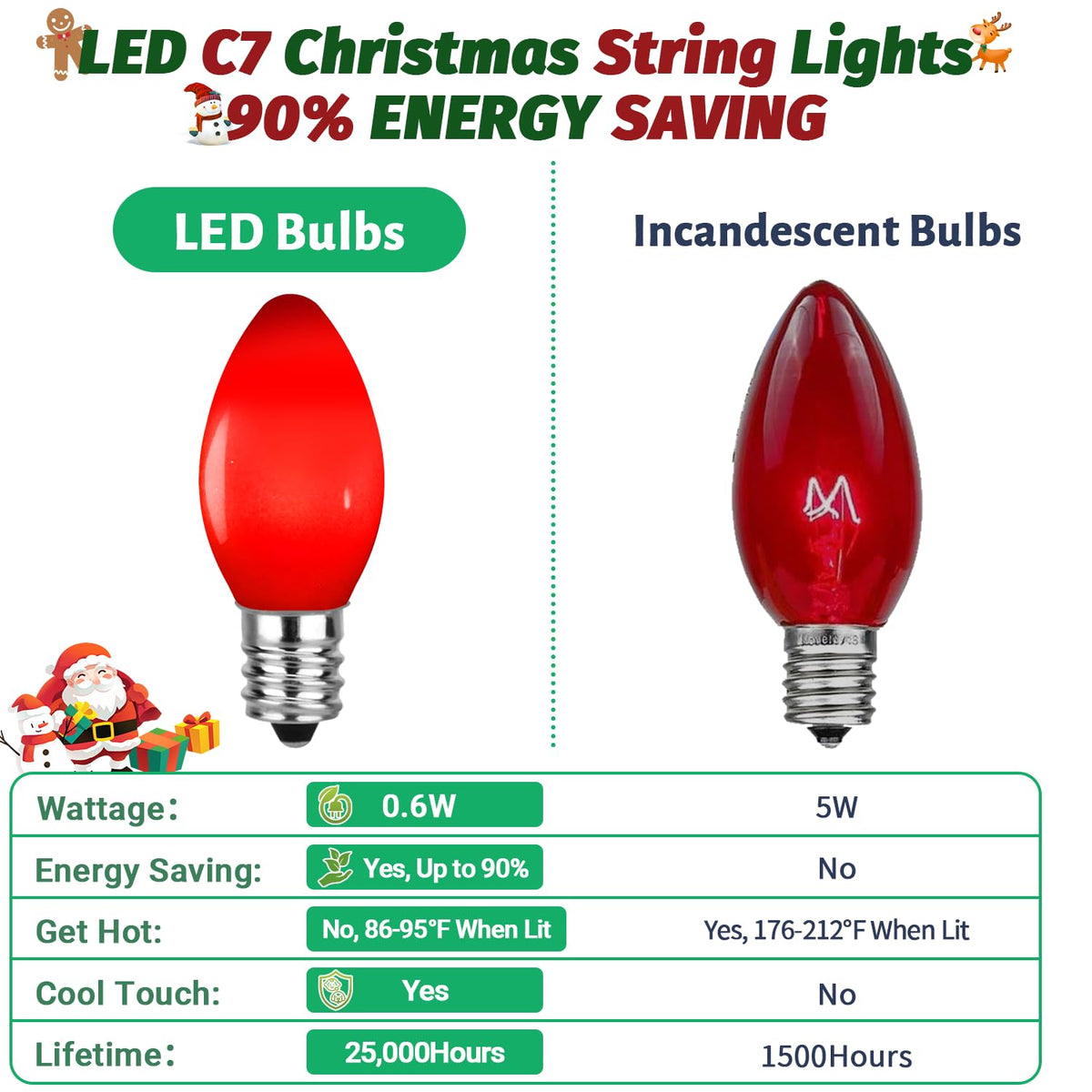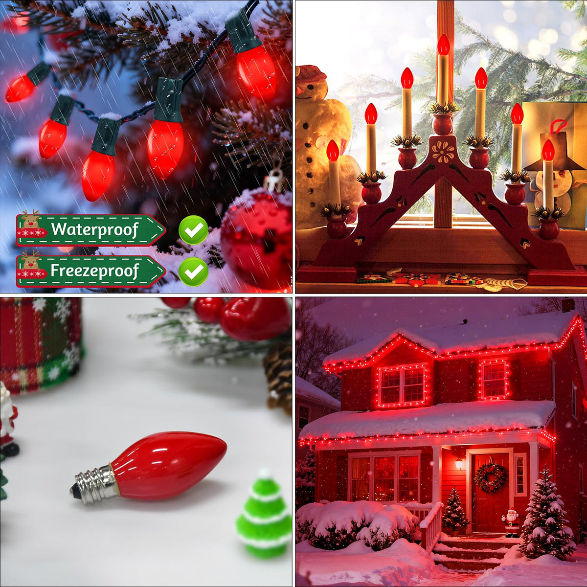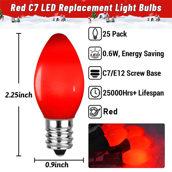 Sotopoo 25 Pack C7 Led Red Replacement Light Bulbs - Ceramic Opaque Red 0.6W 120V C7 Candelabra Base - Perfect For Christmas Tree Christmas Garland String Lights