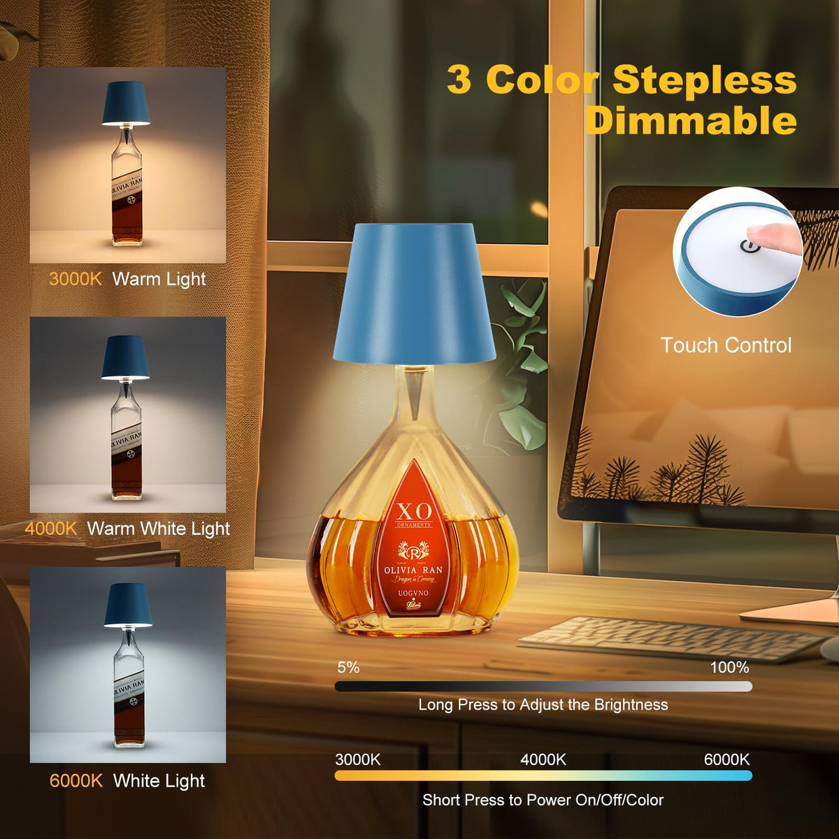 Q: What are the main features of the SOUDFK Wireless Bottle Lamp?A: The SOUDFK Wireless Bottle Lamp features a touch dimmable design, three color options for customizable ambiance, a versatile conical lampshade, cordless portability, and a rechargeable LED system that is eco-friendly and convenient.