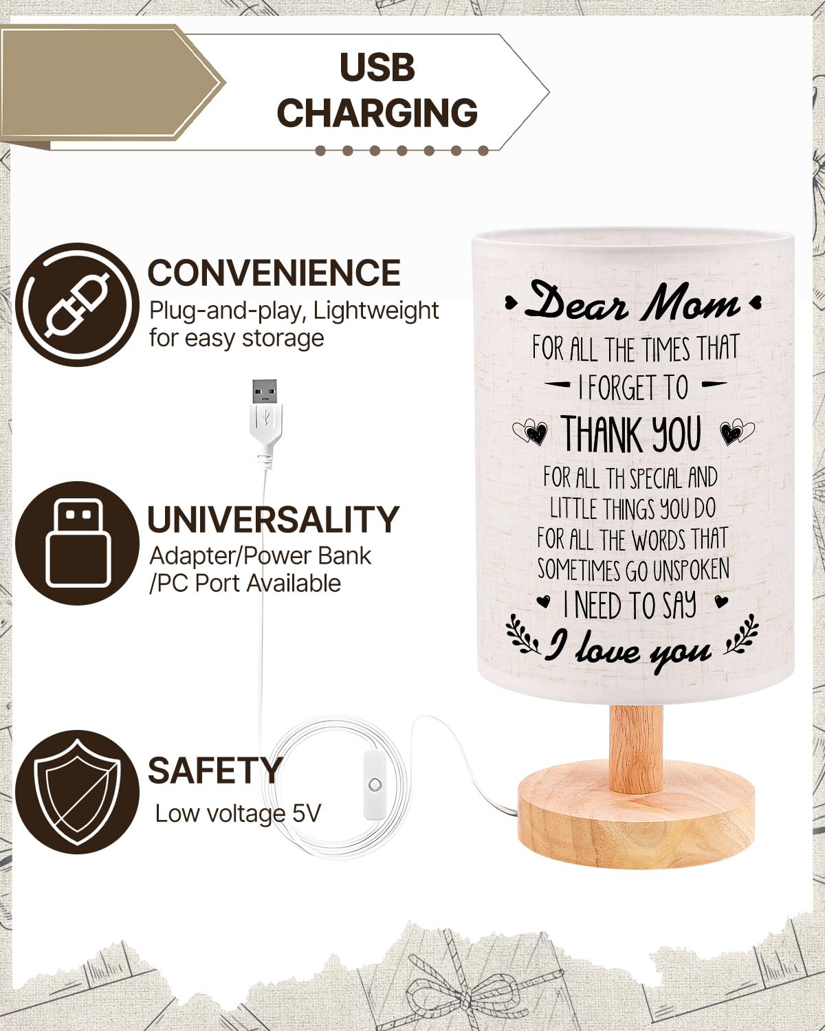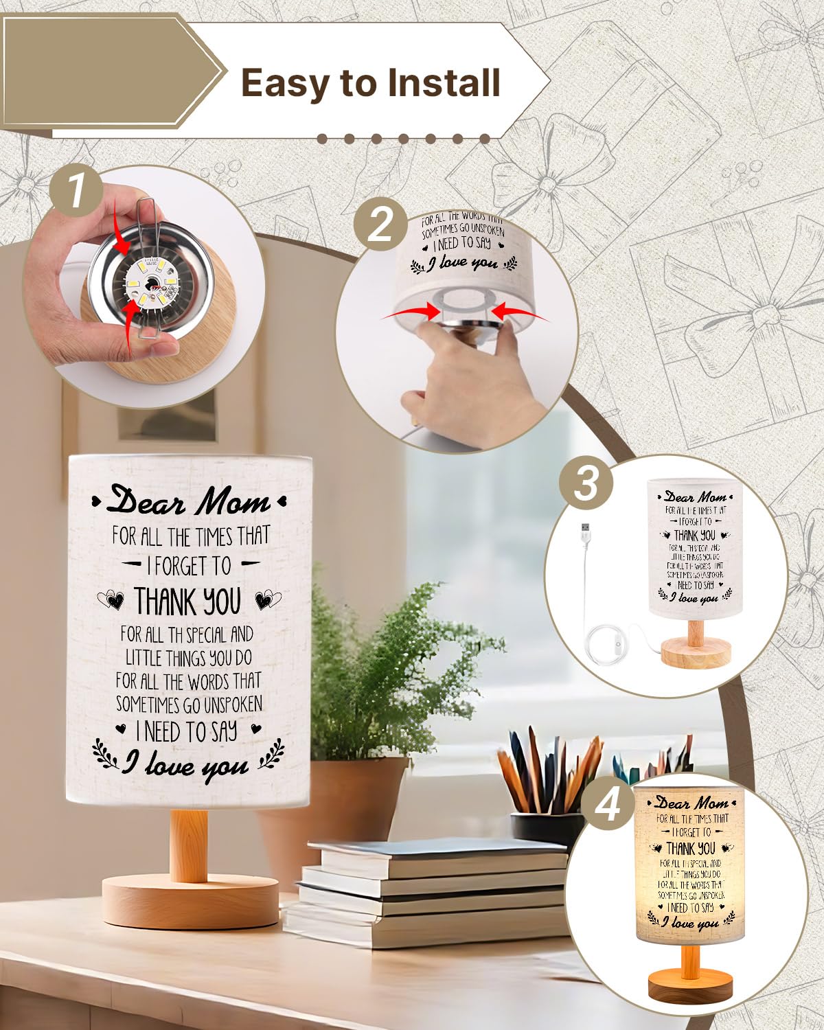 Surprised&Nbsp; Mom Gifts--Birthday Gifts For Mom This Personalized Dad Lamp Can Fully Express Your Love And Appreciation For Your Mom This Is A Surprise And Amazing Gift To Your Mom. No Matter If ItS For MotherS Day Gift Birthday Gift Or Anniversary Day This Is A Great Gift Choice For Your Mom. Creative Home Decoration The Led Lamp Features An well-made Wooden Base And The Most Attractive Light. It Is Pretty When It Lights Up! Led Light Is Soft And Uniform No Dazzling Non-Flicker And Harmless To Eyes. Suitable For All Kinds Of Occasions Such As Room Display Sleeping Night Light Party Lights Home Decoration Etc. Material: Solid Pine Light Source Type: Led Input: Dc 5.0V 1A Wattage: 3W Power Supply: Usb Personalized Gifts For Mom From Daughter Son The Desk Lamp Is Perfect For MotherS Day Gifts Anniversary Gifts Birthday Gifts Christmas Gifts For Mom Step Mom Bonus Mom From Daughter Or Son.