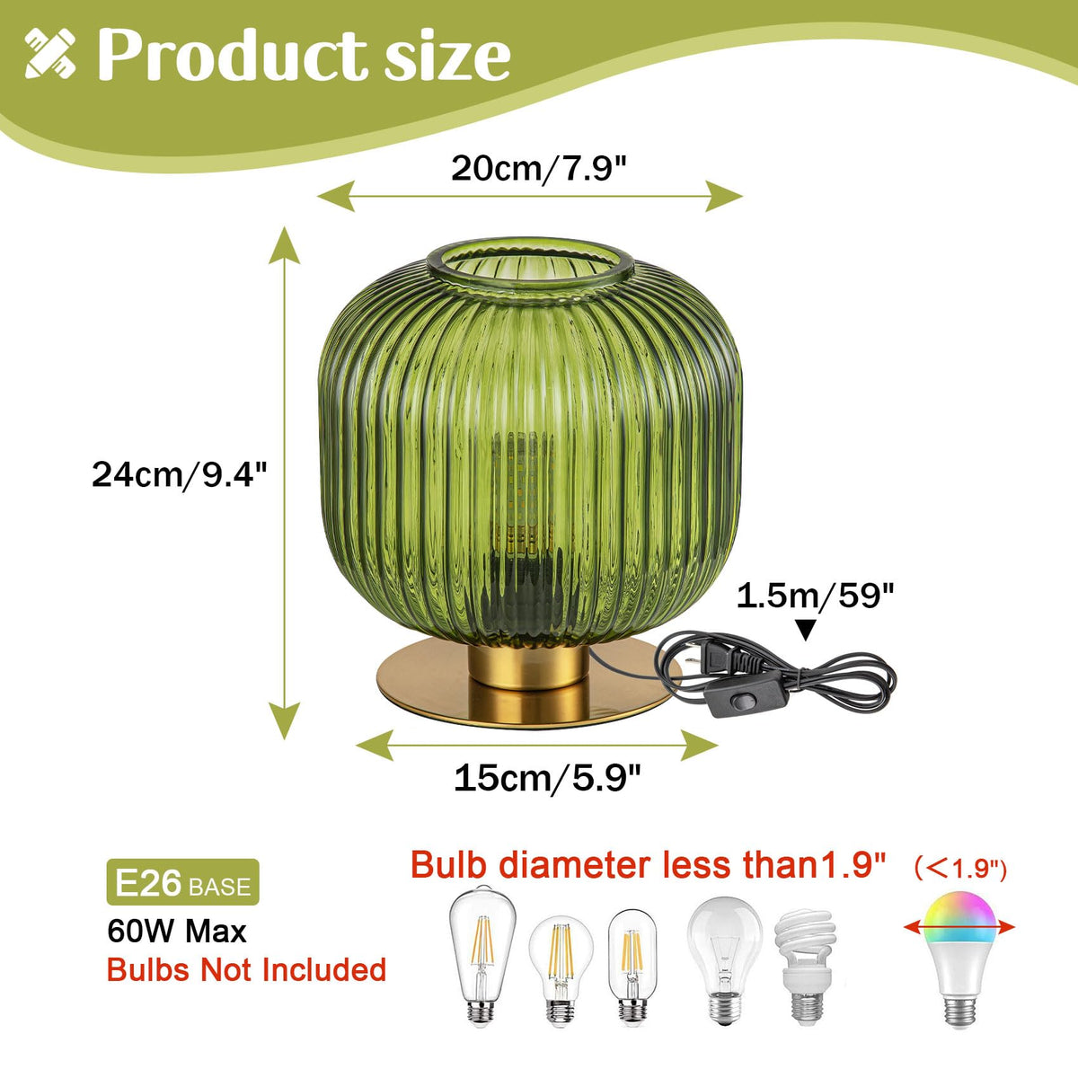 Name: Glass Globe Table Lamp Colour: Amber/Green/Smoke Gray Product: Size: D7.9" x H9.1" Material: Iron + Glass Product style: Modern Voltage: 110V-240V Power: Max 60W Irradiation area: 5-10 square meters Light source: E26* 1 (excluding bulbs)