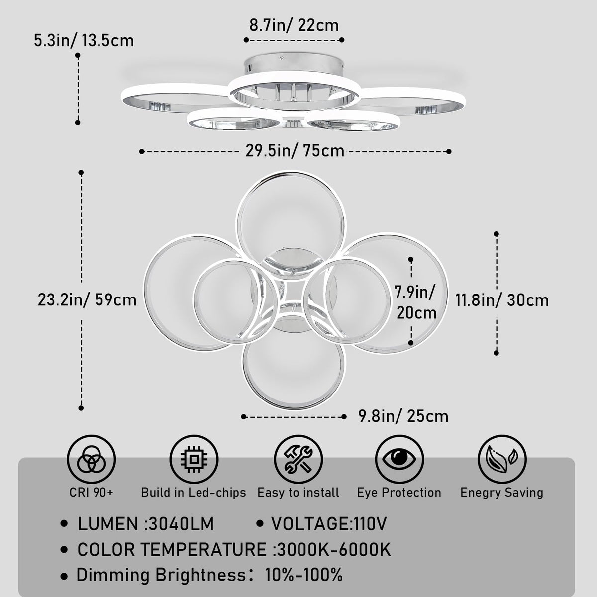 Product Description Product Size: 31.5 Inches (L) X 24.4 Inches (W) X 4.3 Inches (H) Product Material: Iron And Silicone Led Light Source: Dimming, 3 Color Temperatures (3000K - 6000K), Brightness Adjustment Range (10% - 100) Product Power: 60W Product Lumen: 4800Lm Color Rendering Index Ra=90 Product Color: Chrome Working Voltage: 110V Product Specification :1 Pack Applicable Places: The Modern Ceiling Lamps And Lanterns Are Suitable For Kitchen, Dining Room, Living Room, Bedroom, Office And Other Places. Whether You Need Soft Light In The Bedroom Or Bright Lighting In The Kitchen, This Lamp Can Provide Ideal Lighting Effect. Appearance Design And Performance This Ceiling Light Adopts A Unique Design Of 2 Large Circles, 2 Medium Circles And 2 Small Circles Shaped Combination, Which Is Fashionable And Modern, Increasing The Sense Of Space Hierarchy And Suitable For Various Interior Decoration Styles. High Quality Material Iron Body: The Bedroom Ceiling Light Lamp Body Is Made Of High Quality Iron, Which Ensures The Sturdiness And Durability Of The Fixture, And At The Same Time, It Is Rust And Corrosion-Resistant Through Fine Processing And Surface Treatment, Which Enhances The Overall Texture. Silicone Shade: The Modern Ceiling Lamp Shade Is Made Of Soft And Durable Silicone Material With Good Light Transmittance, Which Can Evenly Spread The Light, Reduce Glare And Protect Your Eyes. At The Same Time, The Silicone Material Is High Temperature Resistant, Ensuring The Safety And Stability Of Long-Term Use. Dimmable Function Brightness Adjustment: The Living Room Ceiling Light Can Be Freely Adjusted From 10% To 100% Brightness Range To Meet Different Scenes And Needs. Color Temperature Modes: Modern Ceiling Light Fixtures Provide 3 Color Temperature Modes (3000K-6000K), From Warm Warm Light To Cool White Light, You Can Choose The Right Color Temperature According To Different Occasions And Moods. Remote Control Operation: Equipped With Remote Control, Easy To Operate, You Can Adjust The Brightness And Color Temperature At Any Time. Easy Installation Installation: Assemble The Modern Ceiling Light According To The Instructions Or Installation Video, And Then Fix It To The Ceiling, The Installation Process Is Simple And Clear. After-Sales Service: We Provide Free Return And Exchange Service Within 30 Days And Lifetime Warranty Service, Which Will Give You More Peace Of Mind And Reassurance During The Purchase And Use. This Modern Led Ceiling Light Combines Beauty, Practicality And Durability In One, With Its Unique Appearance Design, High Quality Materials, Flexible Dimmable Function, Diverse Places Of Application And Convenient Installation, Whether It'S A Home Or A Commercial Place, This Fixture Can Bring You An Excellent Lighting Experience.