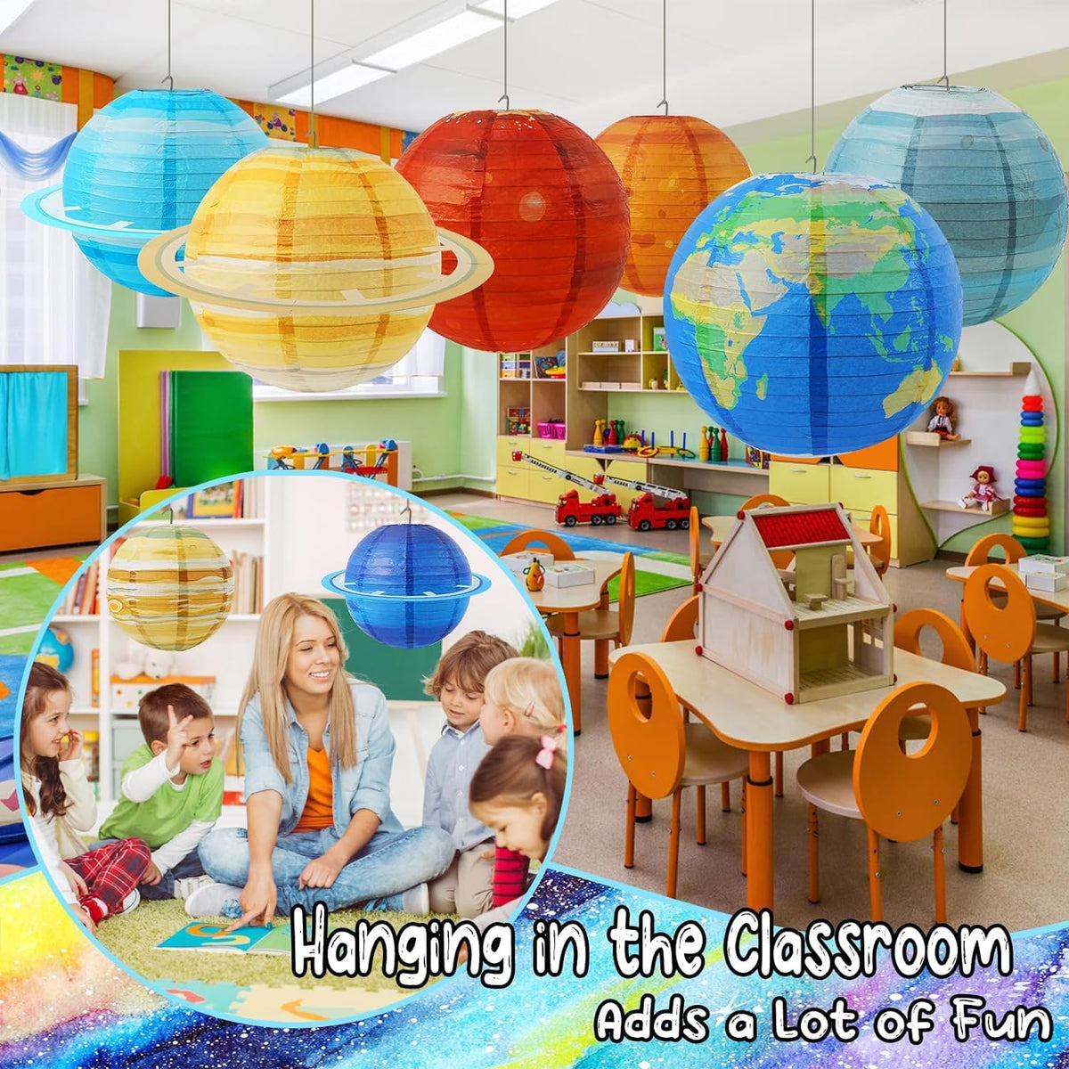 Q: How can I use these lanterns for a space-themed party?A: These lanterns are ideal for space-themed parties, as they include designs of all eight planets in our solar system. You can hang them from ceilings, walls, or outdoor areas to create a vibrant outer space atmosphere. They are also great for educational purposes, helping kids learn about the solar system.