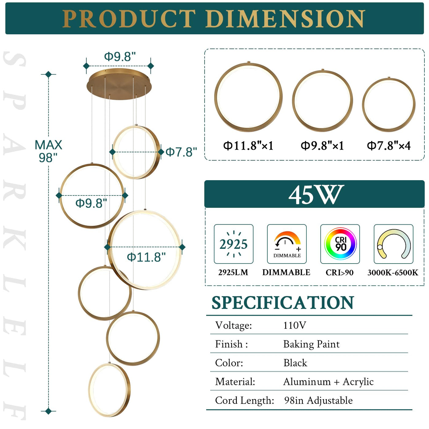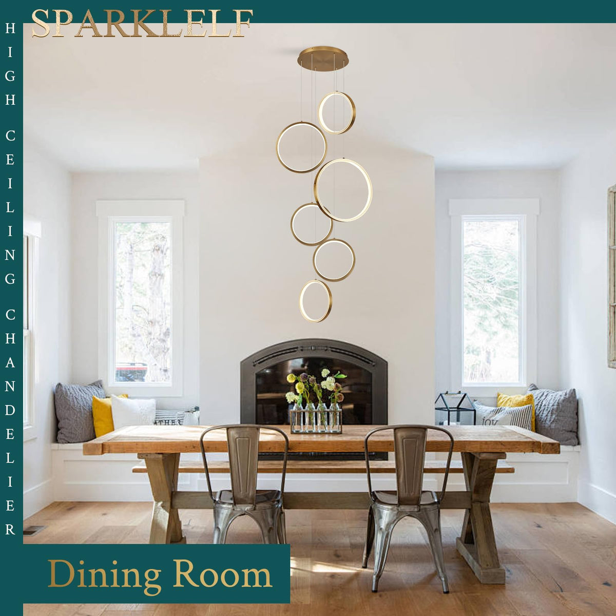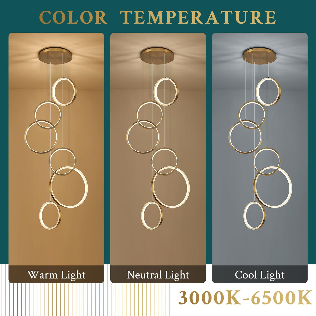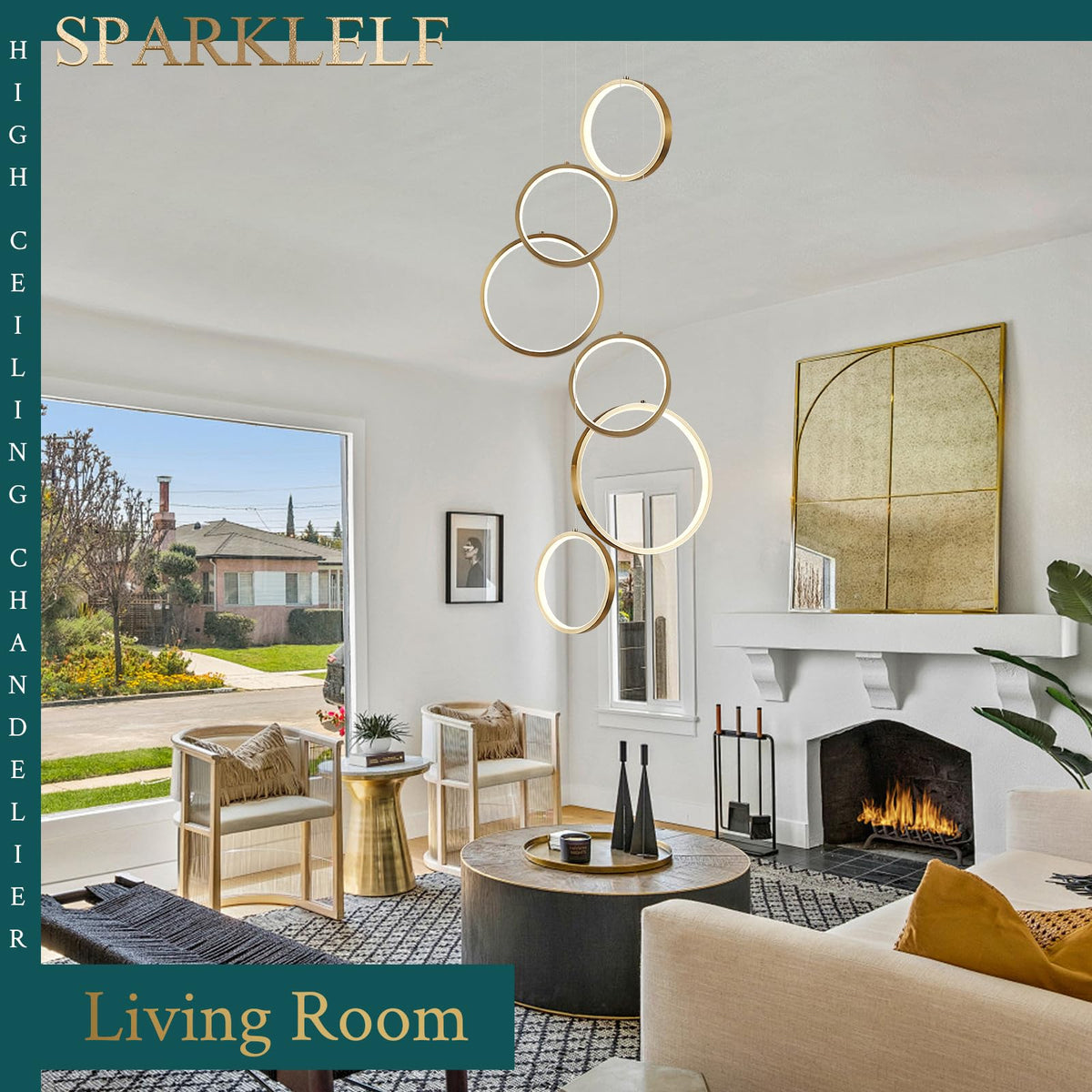 Sparklelf 6 Rings Modern Led Chandelier For High Ceiling Dimmable Gold Contemporary Pendant Light Fixture Long Foyer Chandelier