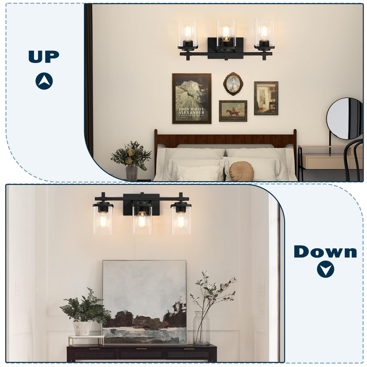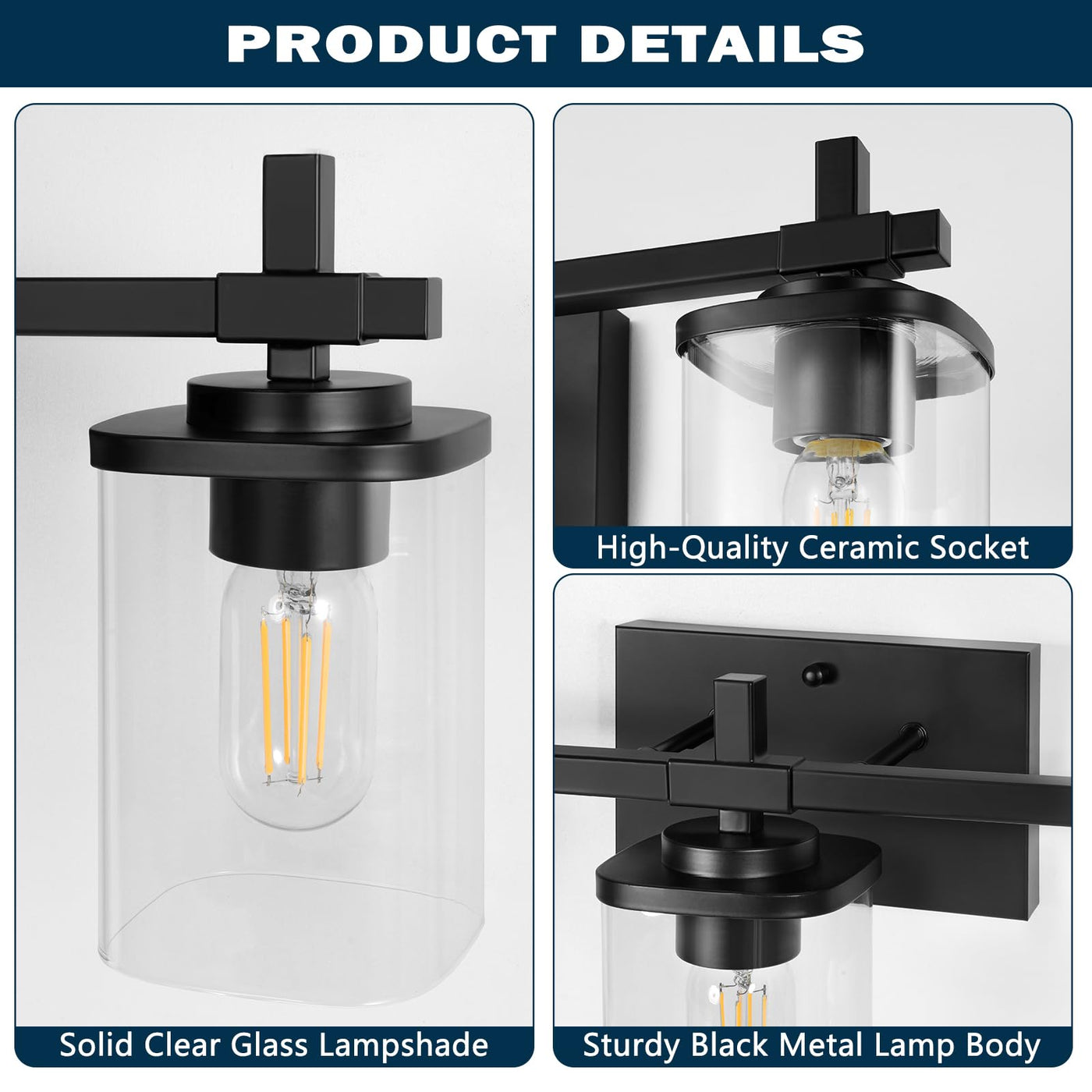 The vanity lighting fixtures feature a sleek matte black finish lamp body accompanied by clear glass shades. The upgraded finish not only adds an elegant touch but also includes a scratch and tarnish-resistant coating, ensuring that the black bathroom light maintains its pristine appearance over time. This exquisite bathroom vanity light is suitable for various decoration styles, making it the perfect choice to enhance your home lighting.