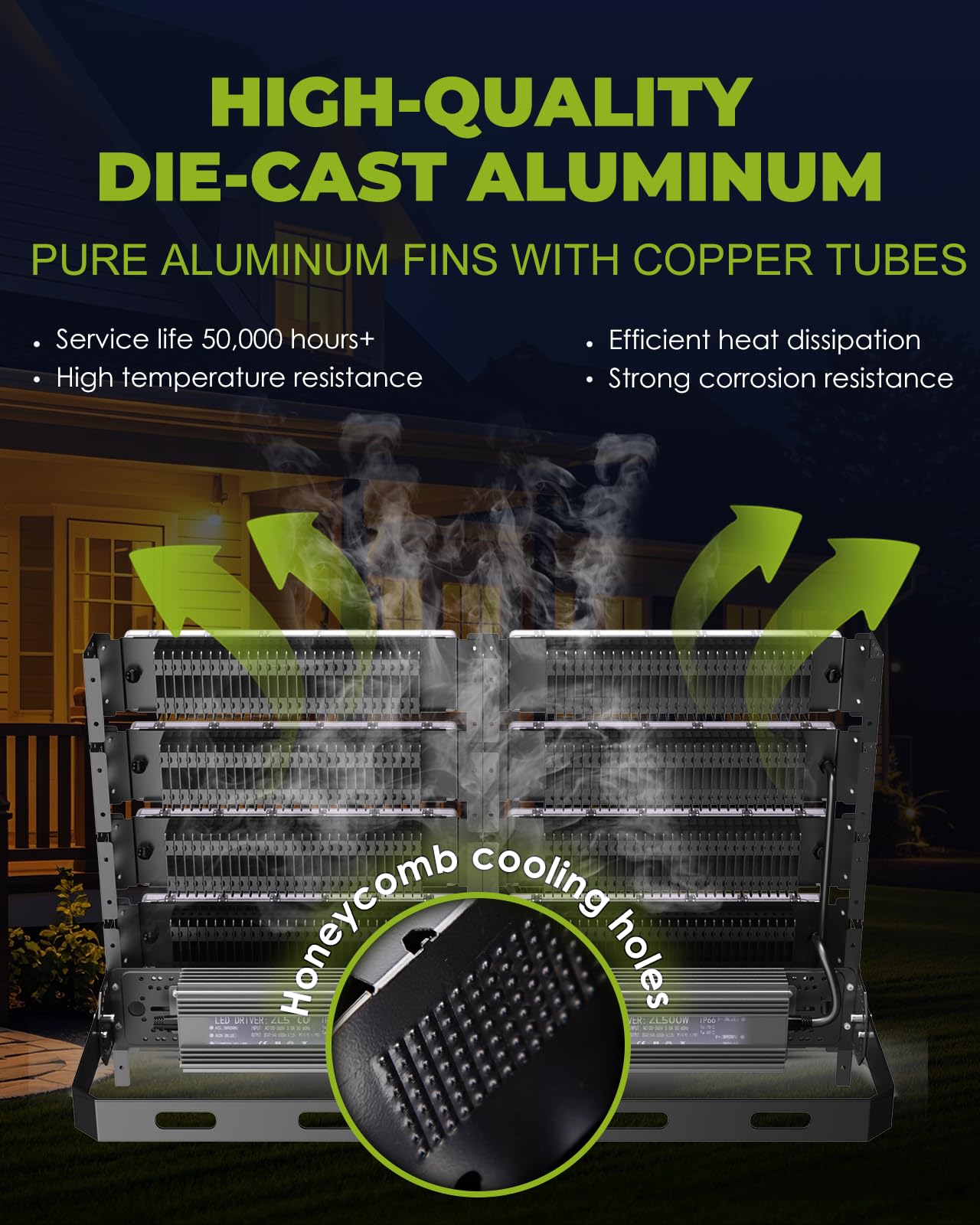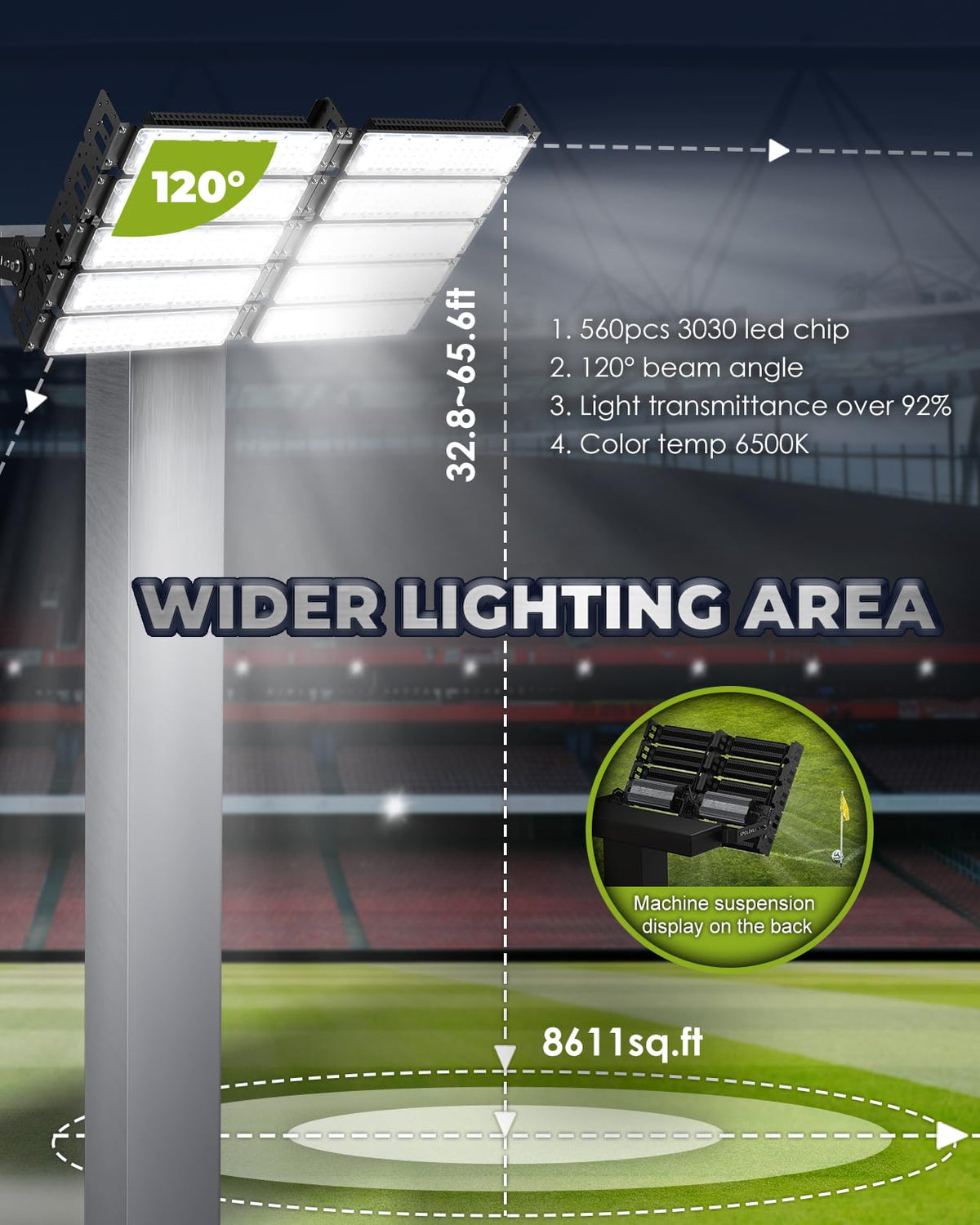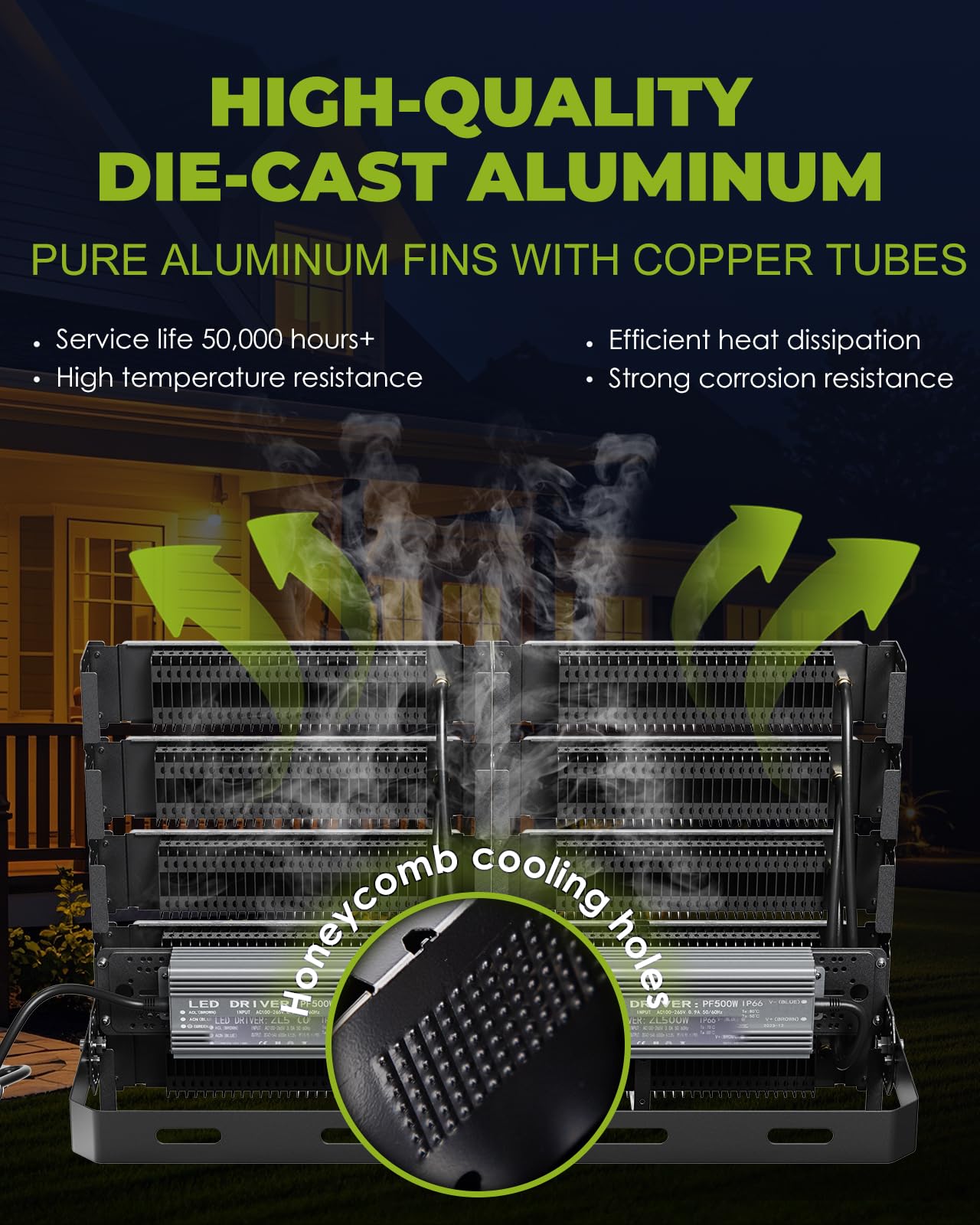 - **Exceptional Brightness**: Producing up to 80,000 lumens with an impressive efficiency of 160lm/w, this 500W LED stadium light replaces traditional 3000W lamps, significantly reducing your electricity costs by up to 90%.