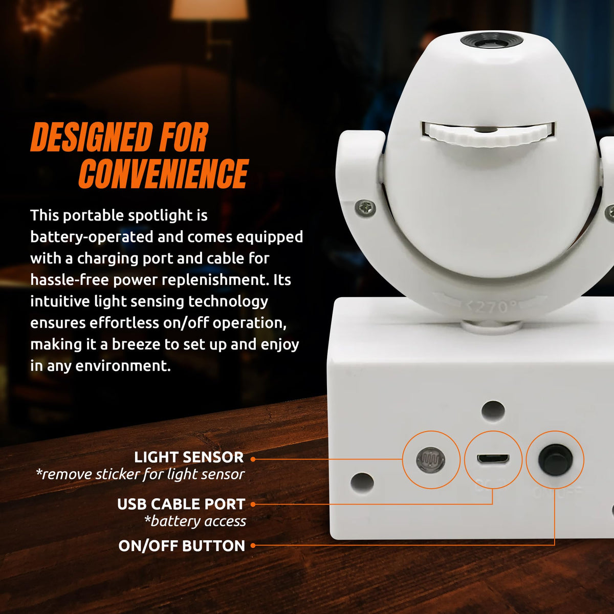 - **Adjustable Projection**: Features an adjustable spotlight that allows you to easily position the image for optimal placement, rotating up/down and left/right to fit your space.
