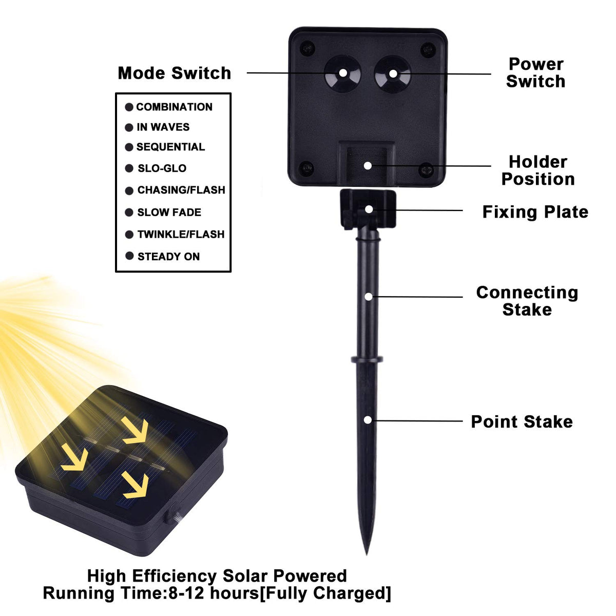 Q: What makes these solar fairy lights different from other string lights?A: These solar fairy lights stand out due to their 8 different lighting modes, durable copper wiring, and the built-in solar panel that allows for eco-friendly operation. They can work for 8-12 hours on a full charge, making them a versatile choice for various occasions.