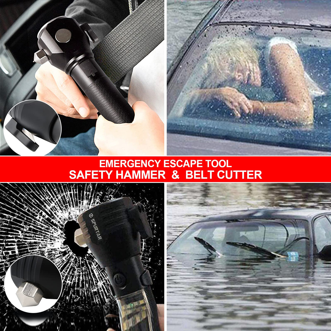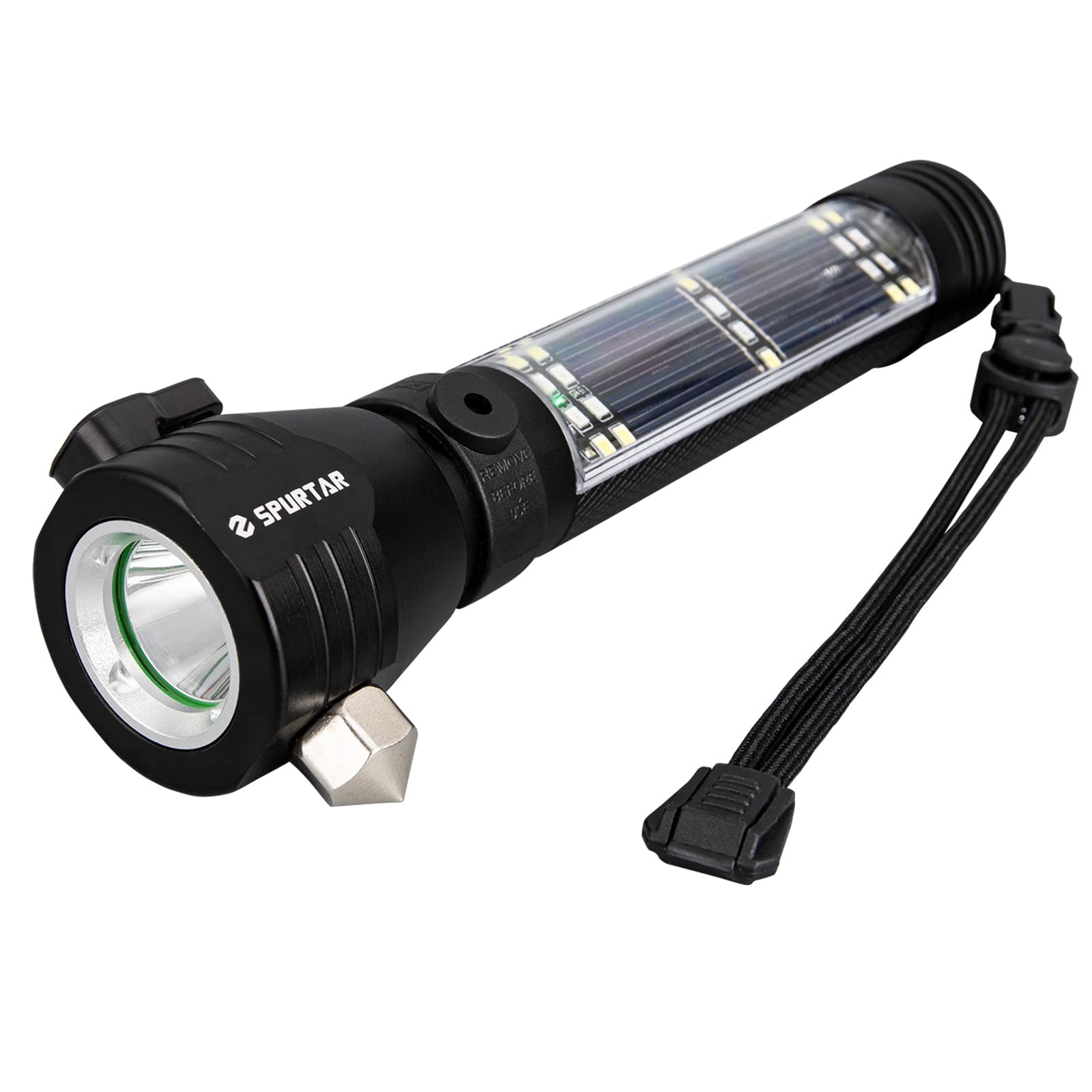 DescriptionSpurtar Solar LED Flashlight for Lighting and A Multi-function Car Emergency Tool for SafetyMulti-function Solar powered and USB rechargeable tactical multi-function torch integrated with emergency tools, such as: Window Breaker, Seat Belt Cutter and Compass a must have outdoor camping tool to lighten up the darkness.FEATURES Emergency light to warn and help you to be visible on the road for higher safety.Safety hammer to break the stuck window for escape out of the car. A seat belt cutter to cut the jammed seat belt. A compass to show the direction, to find your way when hiking, sailing, camping.7 light modes for your different needsBuilt-in magnet for hands-free usage.Drop water resistant and can be used when it rains or snow.1 YEAR WARRANTY BUY WITHOUT RISK ADD TO YOUR BASKET, NOW !HOW TO USE1. Press the switch to turn on the head light, and then short press to switch the head light mode2. The head light provides 3 modes: strong light, weak light and flash light3. Long press the switch to turn on the side light, and then short press to switch the side light mode4. The side light includes red light and white light; the red light provides 2 modes: fast flash and slow flash. The white light provides 2 modes: strong light and weak light5. Please long press the switch when you switch the light source (head light, side white light and side red light)6. Short press to switch the light mode (strong light, weak light, flash, fast flash and slow flash)PACKING INCLUDE1 x Multi-function Solar Powered Flashlight1 x USB CableWITTYWARE SUPPORTIf you have any questions or concerns regarding our product, please feel free to let us know at any time. We would be more than happy to assist you 24/7!