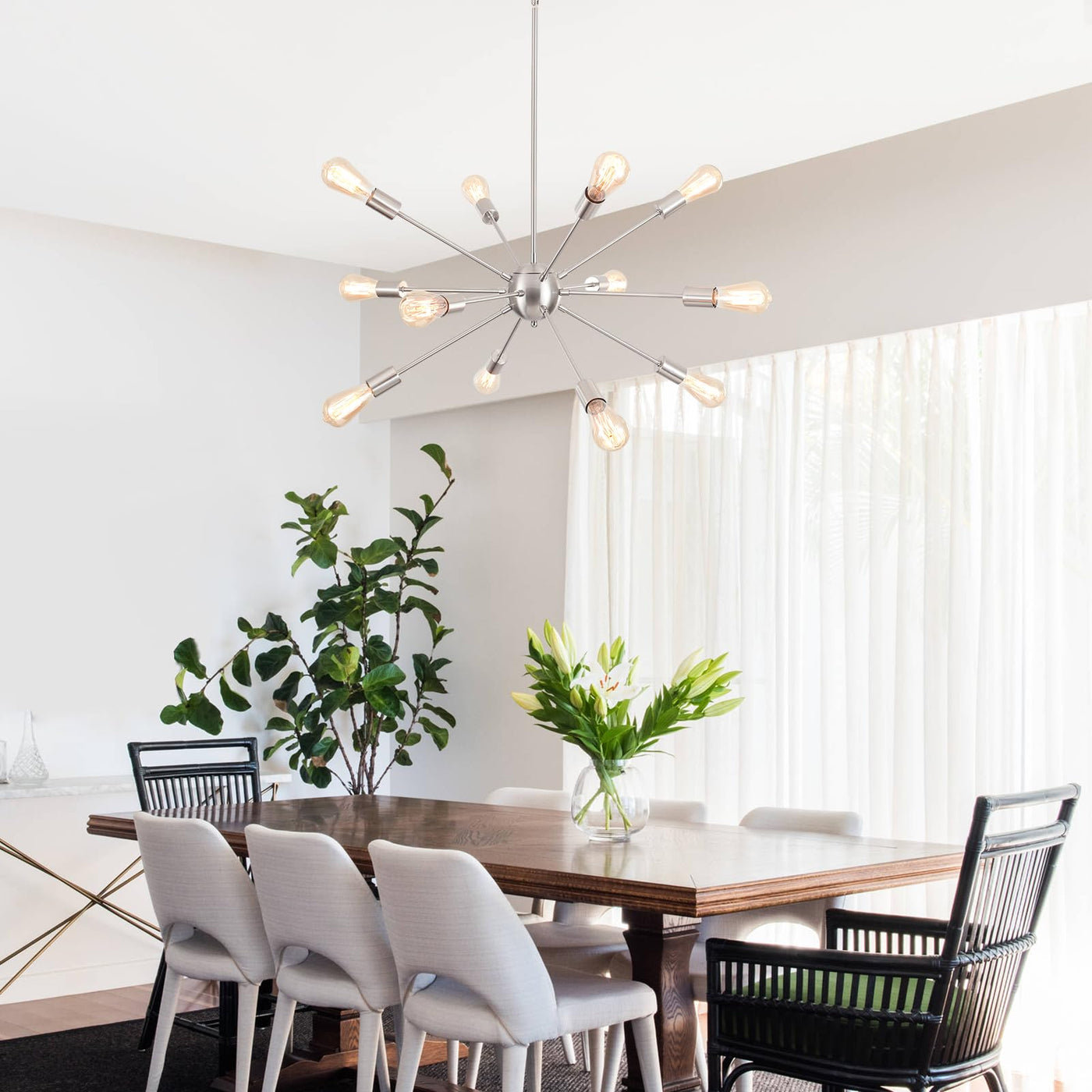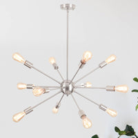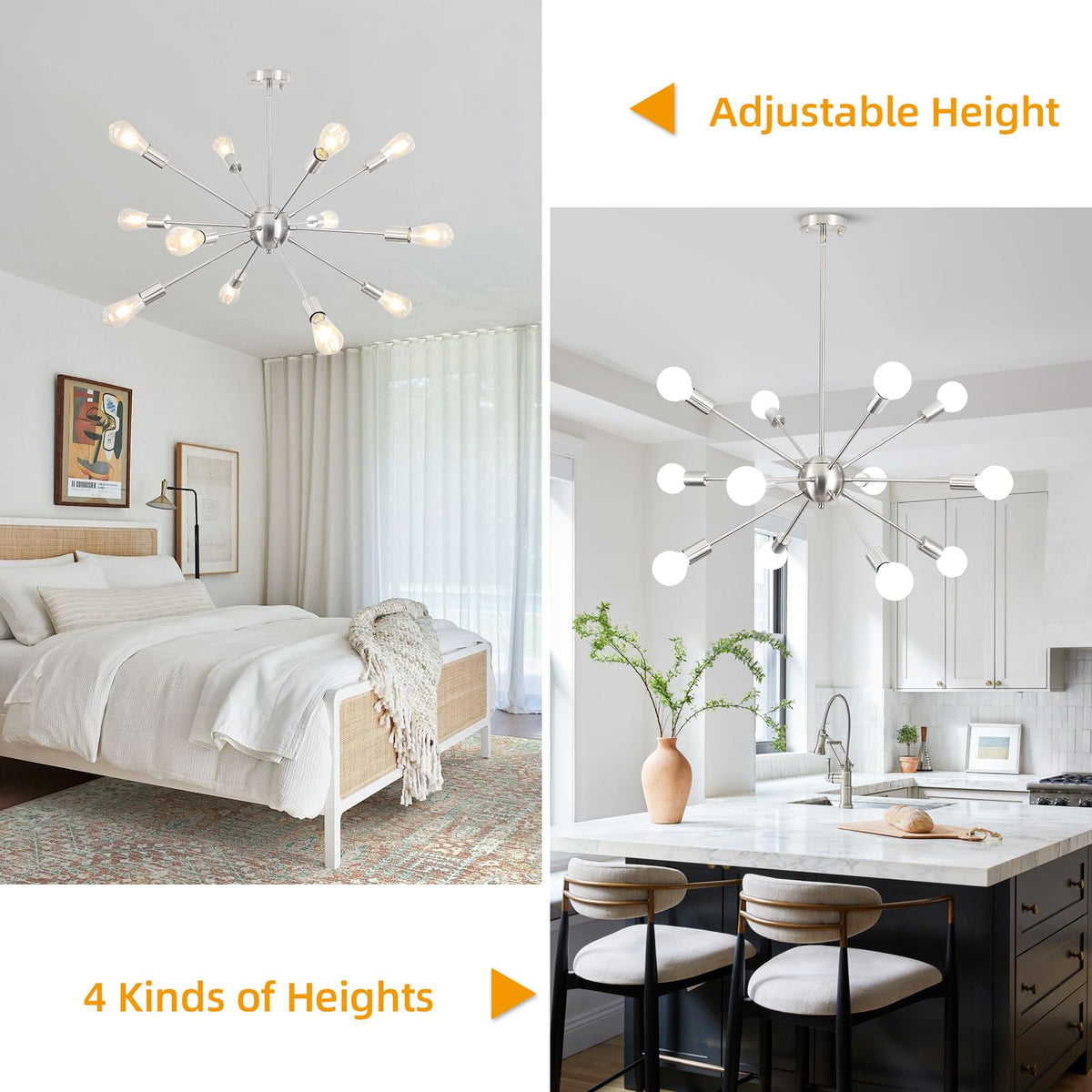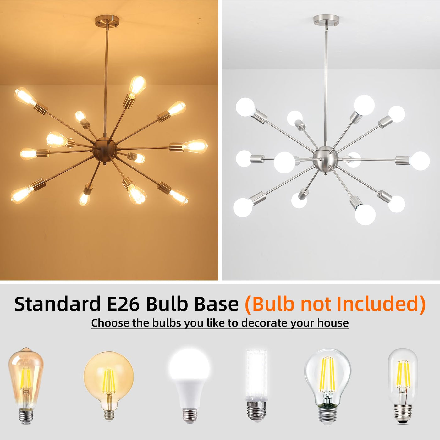 This Brushed Nickel Chandelier Featuring 12 Standard E26 Bulbs Base, Crafted From High-Quality Brushed Nickel Color And A Premium Metal Material. The Dining Room Light Fixture Boasts Durability And Long-Lasting Performance, Creates A Striking Focal Point. Size Of This Chandelier: Max Wide: 30 Inch/76Cm; The Diameter Of Canopy: 4.7 Inch/12Cm; The Length Of Each Arm Is 12.5 Inch/32Cm; The Centrl Ball Diameter Is 4.7 Inch/12Cm. This Silver Sputnik Light Required 12 X E26 Base Bulbs (Bulbs Not Included), Widly Compatible With Led, Tungsten Bulbs, Cfl And Incandescent, Per Bulb Max 60W